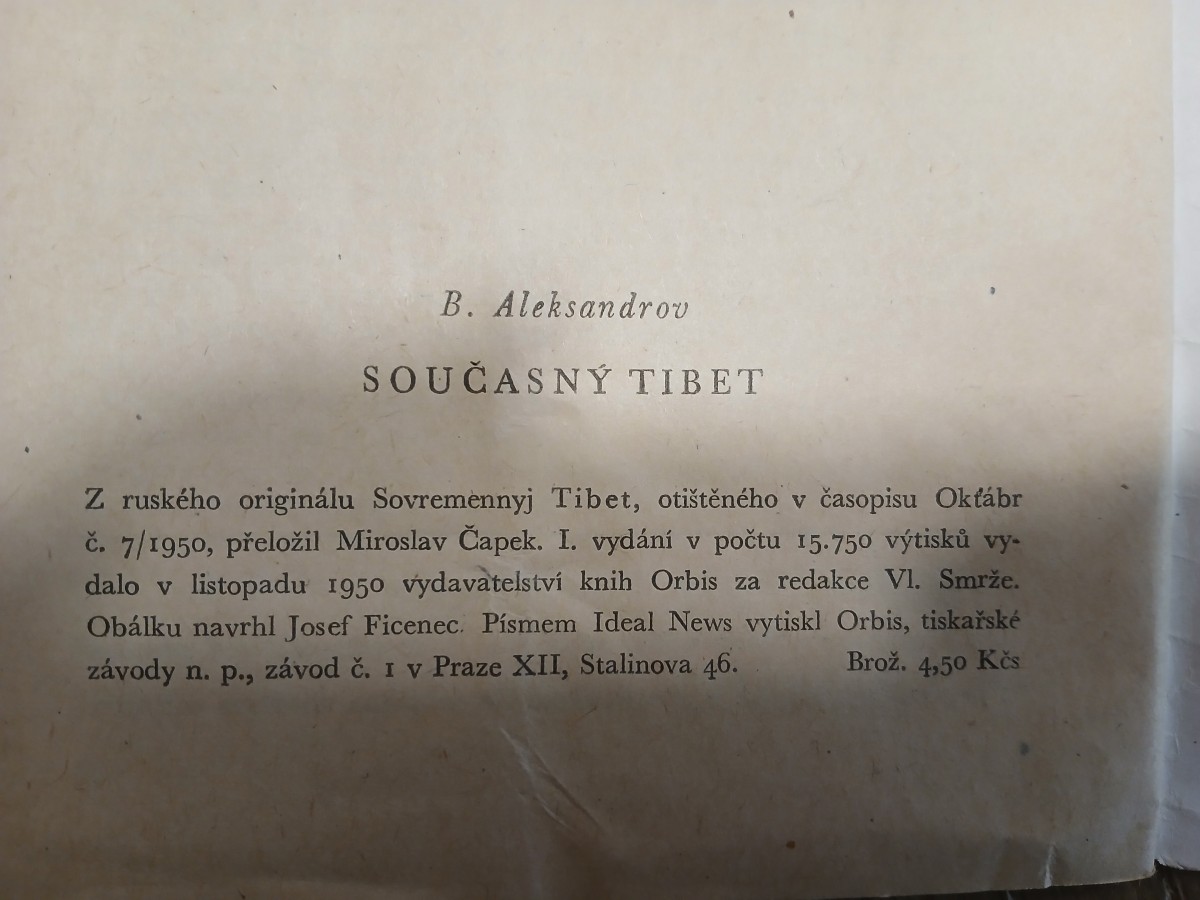 | Digitalizovaná tiráž: | B. Aleksandrov SOUČASNÝ TIBET Z ruského originálu Sovremennyj Tibet, otištěného v časopisu Okťábr č. 7/1950, přeložil Miroslav Čapek. I. vydání v počtu 15.750 výtisků vy- dalo v listopadu 1950 vydavatelství knih Orbis za redakce Vl. Smrže. Obálku navrhl Josef Ficenec. Písmem Ideal News vytiskl Orbis, tiskařské závody n. p., závod č. 1 v Praze XII, Stalinova 46. Brož. 4,50 Kčs |