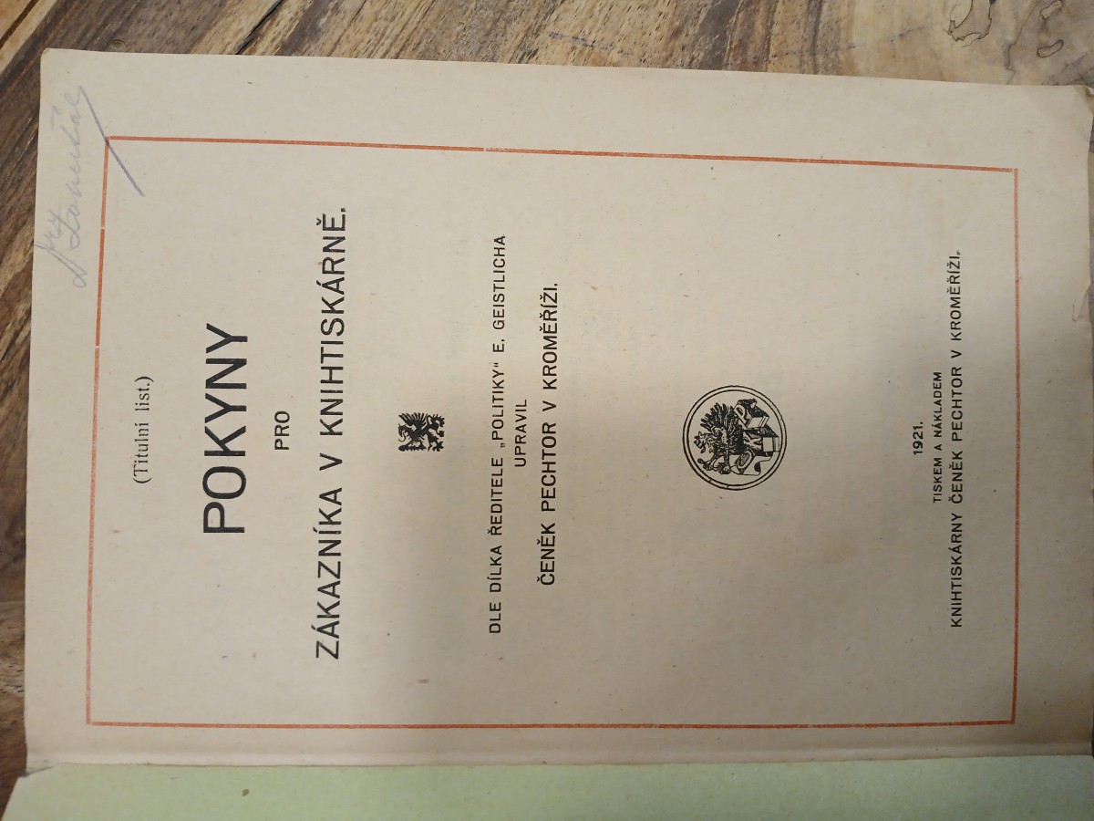 | Digitalizovaná tiráž: | (Titulní list.) POKYNY PRO ZÁKAZNÍKA V KNIHTISKÁRNĚ. ☑ DLE DÍLKA ŘEDITELE POLITIKY" E. GEISTLICHA UPRAVIL ČENĚK PECHTOR V KROMĚŘÍŽI. 1921. TISKEM A NÁKLADEM KNIHTISKÁRNY ČENĚK PECHTOR V KROMĚŘÍŽI. |