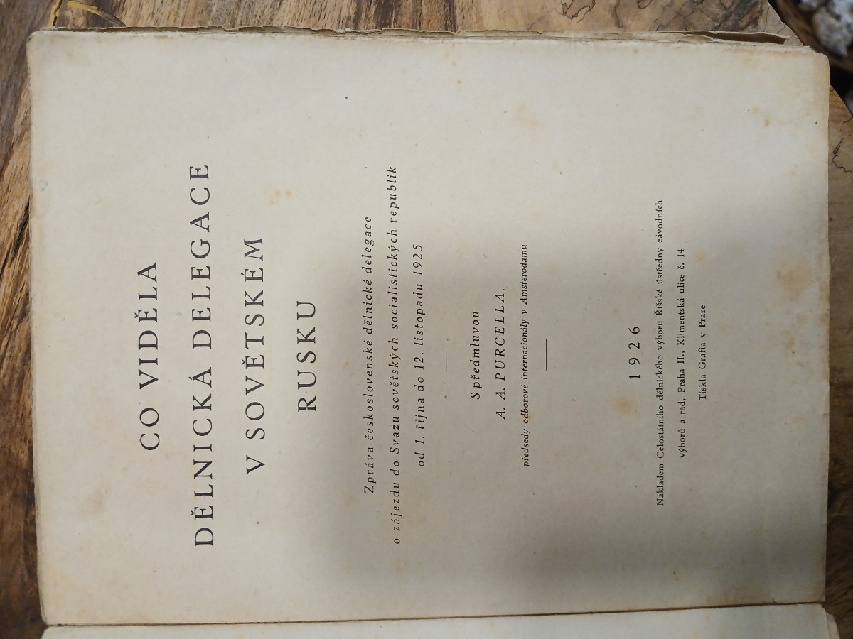 | Digitalizovaná tiráž: | CO VIDĚLA DĚLNICKÁ DELEGACE V SOVĚTSKÉM RUSKU Zpráva československé dělnické delegace o zájezdu do Svazu sovětských socialistických republik od 1. října do 12. listopadu 1925 S předmluvou A. A. PURCELLA, předsedy odborové internacionály v Amsterodamu 1926 Nákladem Celostátního dělnického výboru Říšské ústředny závodních výborů a rad, Praha II., Klimentská ulice č. 14 Tiskla Grafia v Praze. |