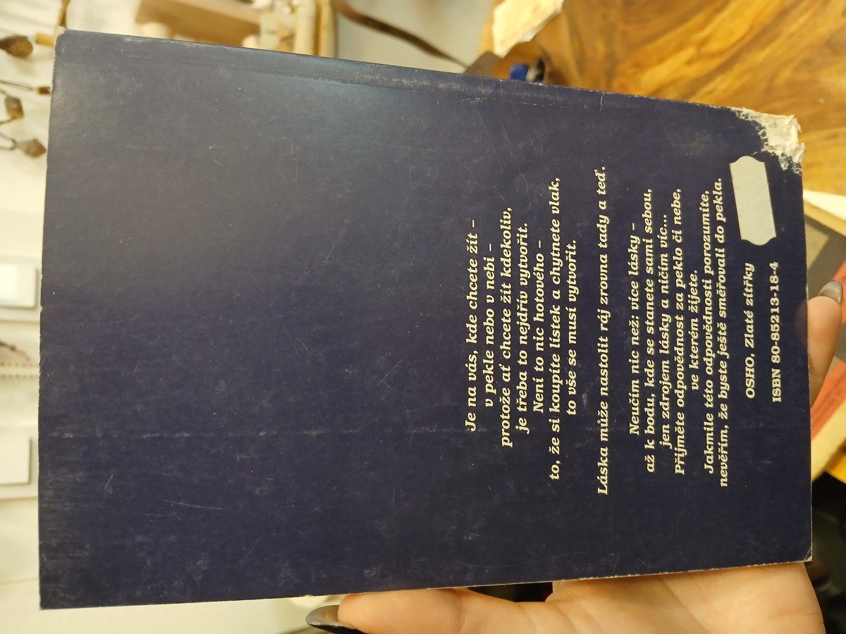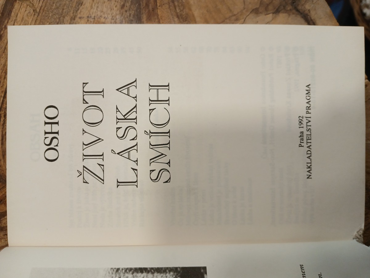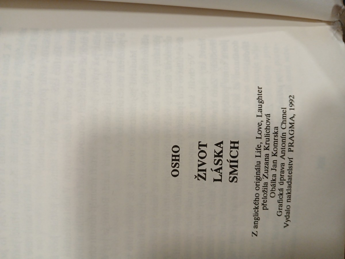 | Digitalizovaná tiráž: | OSHO ŽIVOT LÁSKA SMÍCH Z anglického originálu Life, Love, Laughter přeložila Zuzana Krulichová Obálka Jan Komrska Grafická úprava Antonín Chmel Vydalo nakladatelství PRAGMA, 1992 |