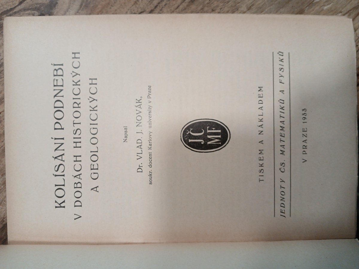 | Digitalizovaná tiráž: | KOLÍSÁNÍ PODNEBÍ V DOBÁCH HISTORICKÝCH A GEOLOGICKÝCH Napsal Dr. VLAD. J. NOVÁK, soukr. docent Karlovy university v Praze JC MF TISKEM A NÁKLADEM JEDNOTY ČS. MATEMATIKŮ A FYSIKU V PRAZE 1933 |
