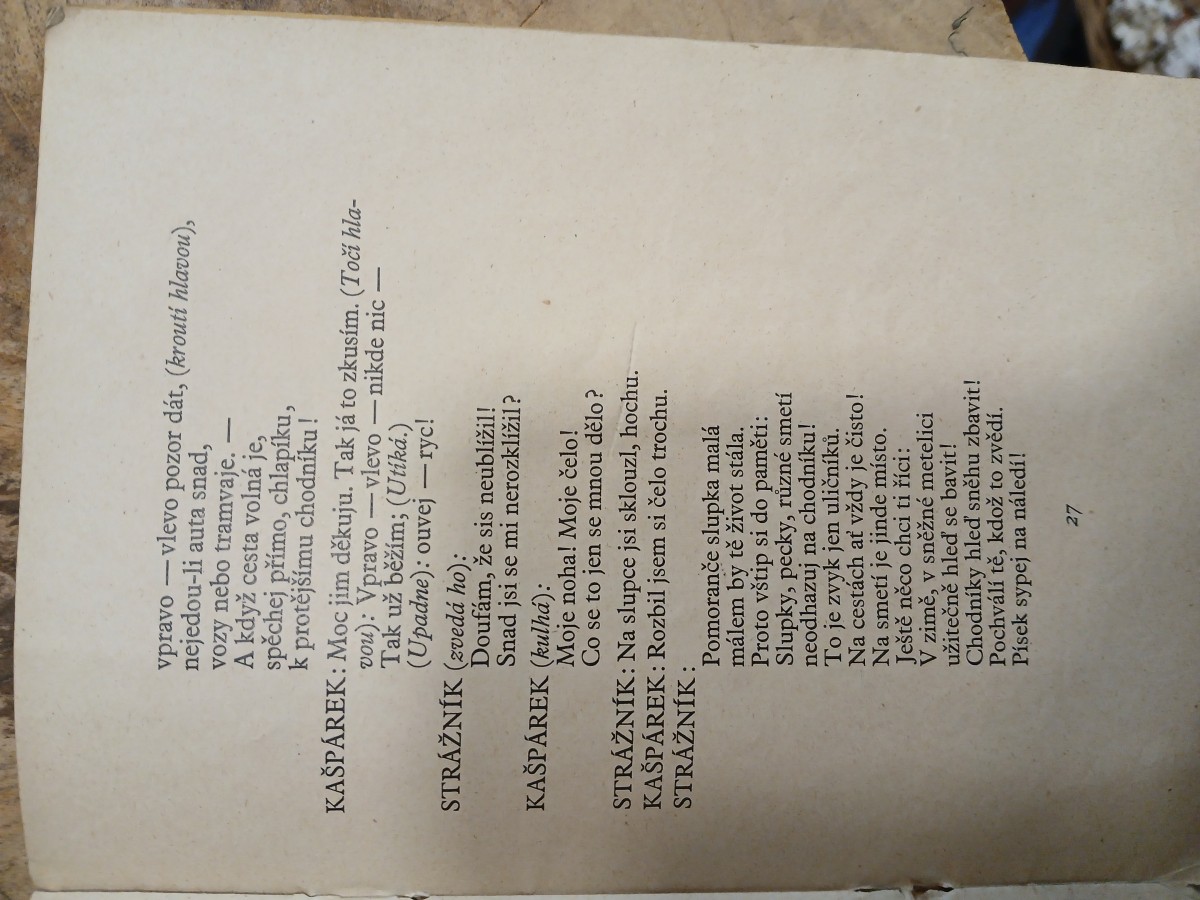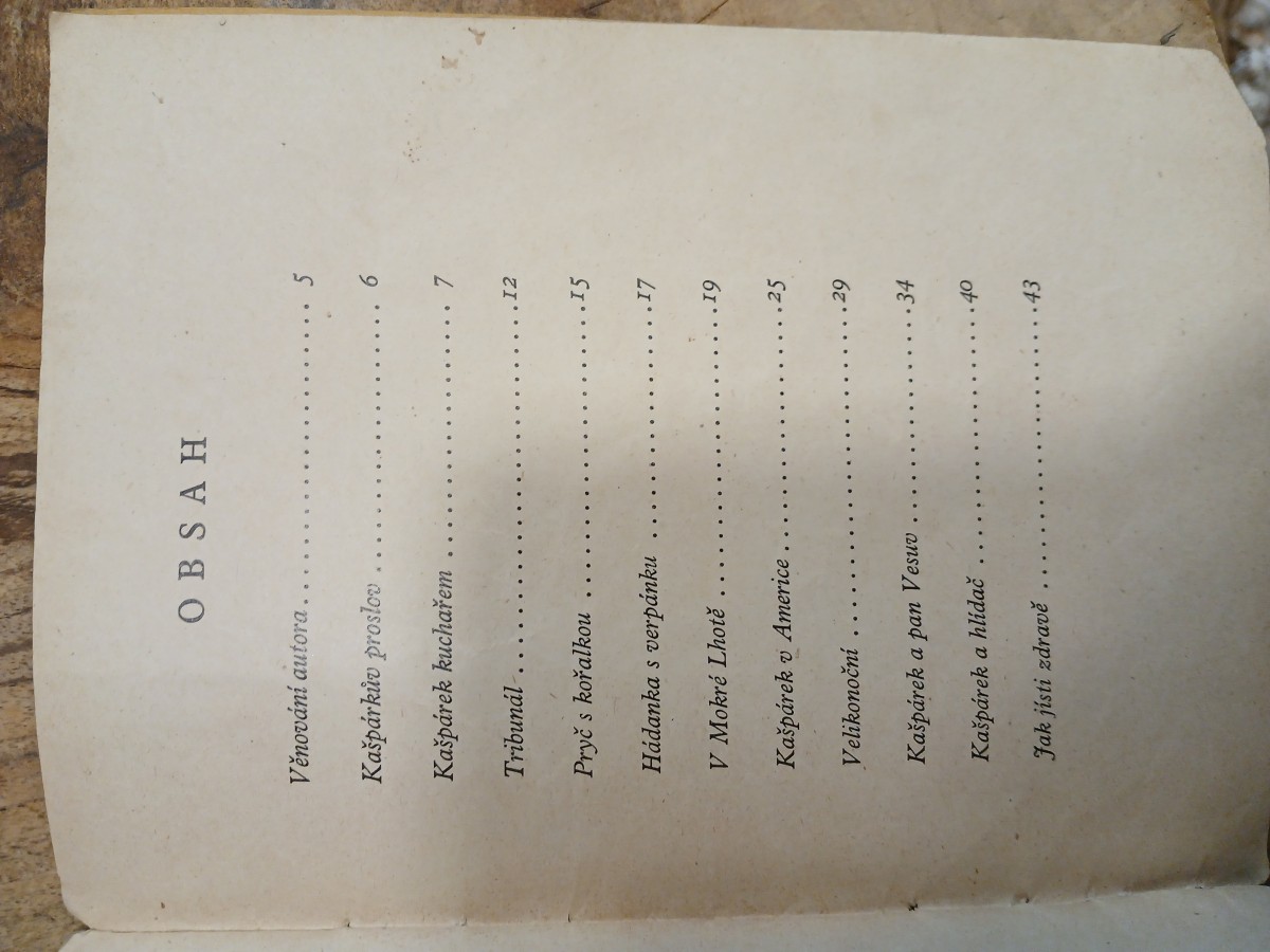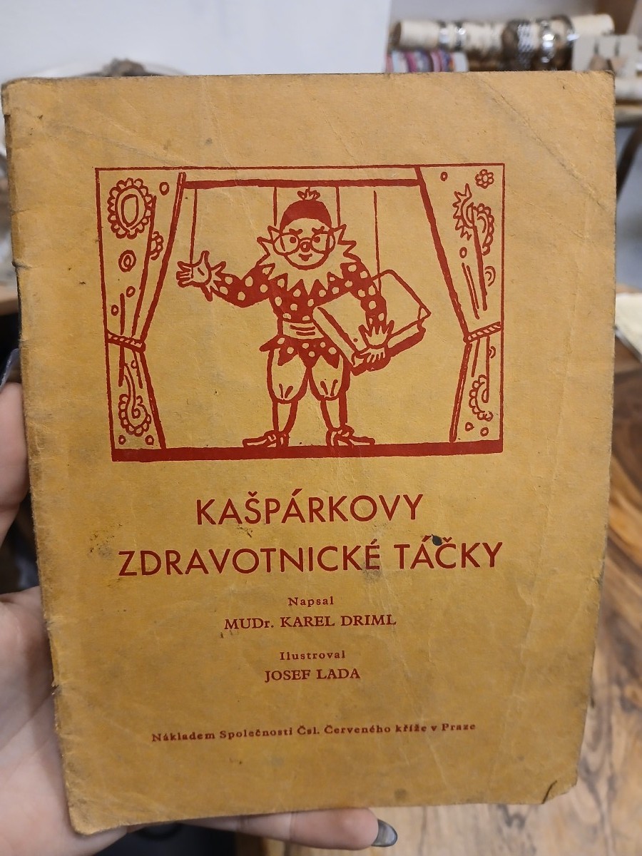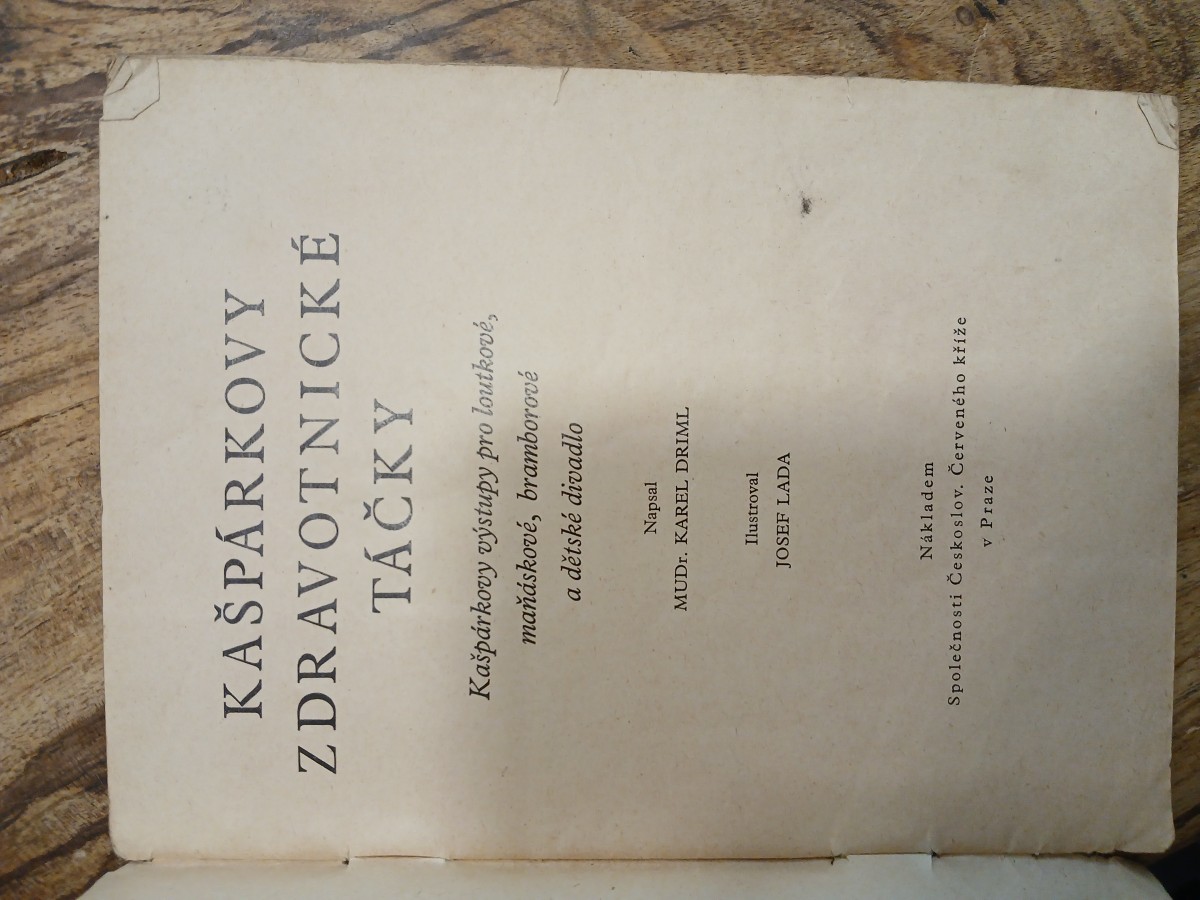 | Digitalizovaná tiráž: | KAŠPÁRKOVY ZDRAVOTNICKÉ TÁČKY Kašpárkovy výstupy pro loutkové, maňáskové, bramborové a dětské divadlo Napsal MUDr. KAREL DRIML Ilustroval JOSEF LADA Nákladem Společnosti Českoslov. Červeného kříže v Praze |