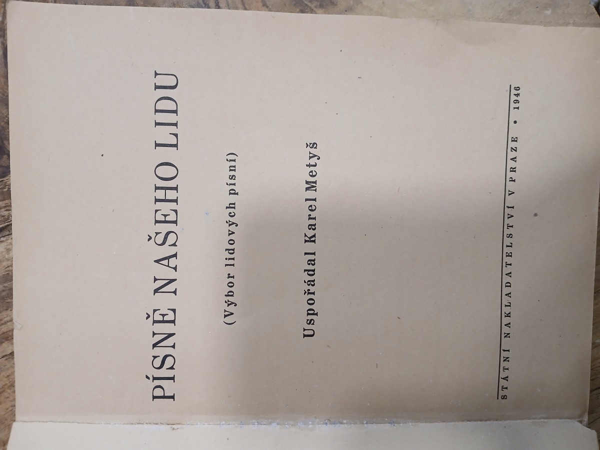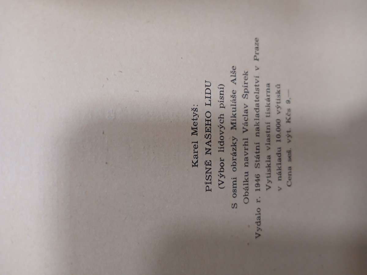 | Digitalizovaná tiráž: | Karel Metyš: PÍSNĚ NAŠEHO LIDU (Výbor lidových písní) S osmi obrázky Mikuláše Alše Obálku navrhl Václav Špírek Vydalo r. 1946 Státní nakladatelství v Praze Vytiskla vlastní tiskárna v nákladu 10.000 výtisků Cena seš. výt. Kes 9, |