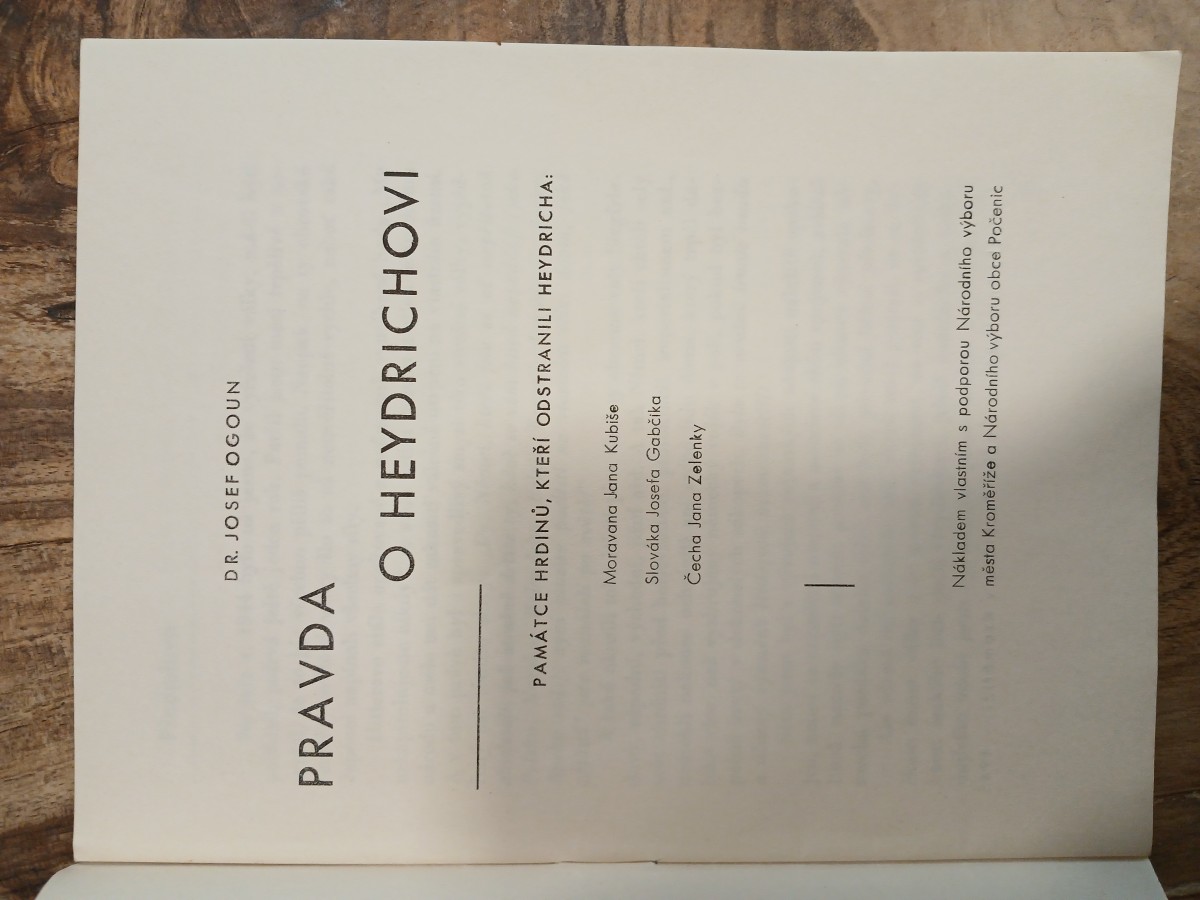 | Digitalizovaná tiráž: | DR. JOSEF OGOUN PRAVDA O HEYDRICHOVI PAMÁTCE HRDINŮ, KTEŘÍ ODSTRANILI HEYDRICHA: Moravana Jana Kubiše Slováka Josefa Gabčíka Čecha Jana Zelenky Nákladem vlastním s podporou Národního výboru města Kroměříže a Národního výboru obce Počenic |