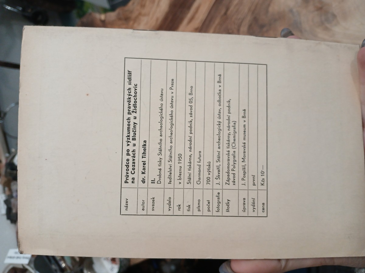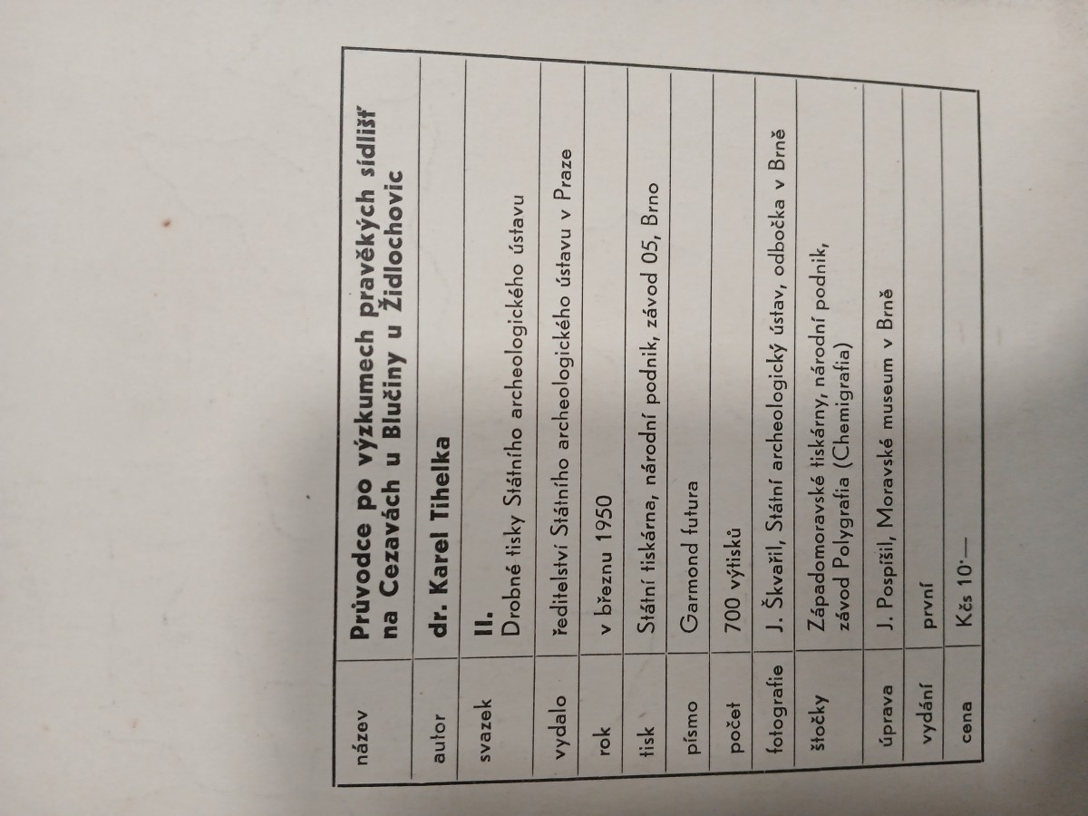 | Digitalizovaná tiráž: | název Průvodce po výzkumech pravěkých sídlišť na Cezavách u Blučiny u Židlochovic dr. Karel Tihelka autor svazek II. vydalo rok tisk písmo počet fotografie Stolky Drobné tisky Státního archeologického ústavu ředitelství Státního archeologického ústavu v Praze v březnu 1950 Státní tiskárna, národní podnik, závod 05, Brno Garmond futura 700 výtisků J. Škvařil, Státní archeologický ústav, odbočka v Brně Západomoravské tiskárny, národní podnik, závod Polygrafia (Chemigrafia) J. Pospíšil, Moravské museum v Brně úprava vydání první cena Kčs 10- |