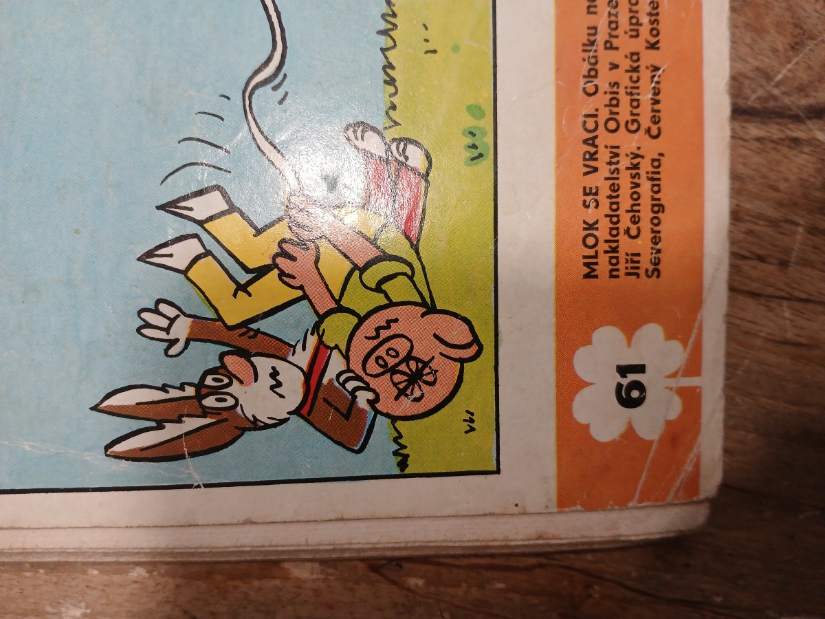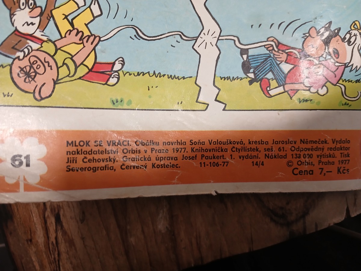 | Digitalizovaná tiráž: | V M 1.- ma 61 MLOK SE VRACI. Obálku navrhla Soňa Valoušková, kresba Jaroslav Němeček. Vydalo nakladatelství Orbis v Praze 1977. Knihovnička Čtyřlístek, seš. 61. Odpovědný redaktor Jiří Čehovský. Grafická úprava Josef Paukert. 1. vydání. Náklad 133 000 výtisků. Tisk 11-106-77 © Orbis, Praha 1977 Severografia, Červený Kostelec. Cena 7,- Kčs 14/4 |