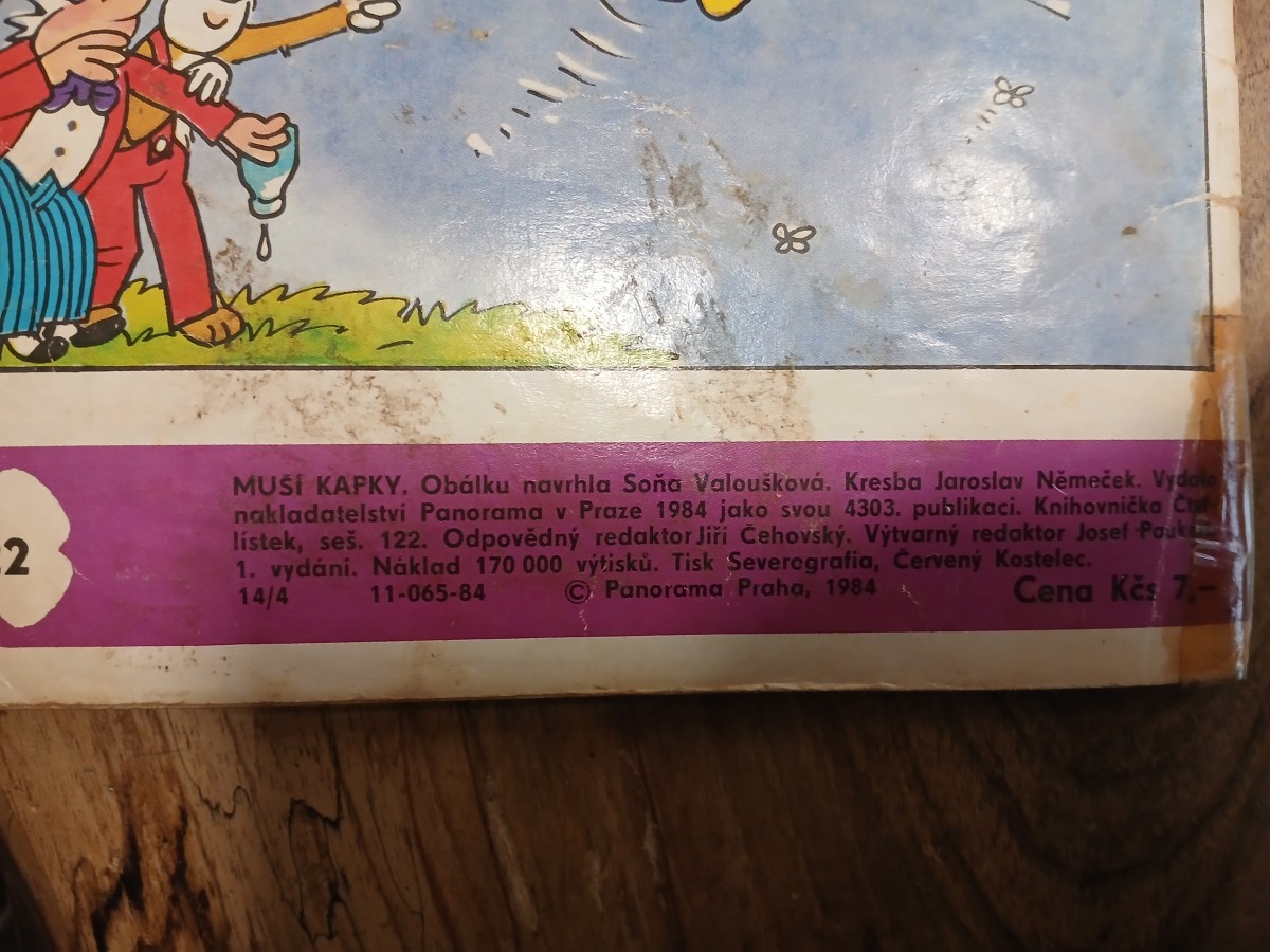 | Digitalizovaná tiráž: | 88 880 98... 2 MUŠI KAPKY. Obálku navrhla Soňa Valoušková. Kresba Jaroslav Němeček. Vydalo nakladatelství Panorama v Praze 1984 jako svou 4303. publikaci. Knihovnička C lístek, seš. 122. Odpovědný redaktor Jiří Čehovský. Výtvarný redaktor Josef Pauk 1. vydání. Náklad 170 000 výtisků. Tisk Severografia, Červený Kostelec. 14/4 11-065-84 © Panorama Praha, 1984 Cena Kčs 7- |