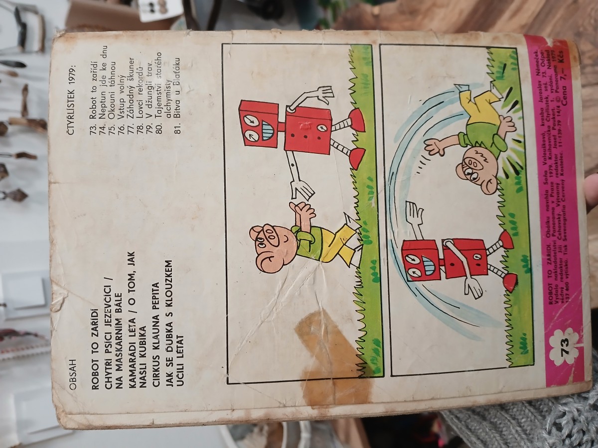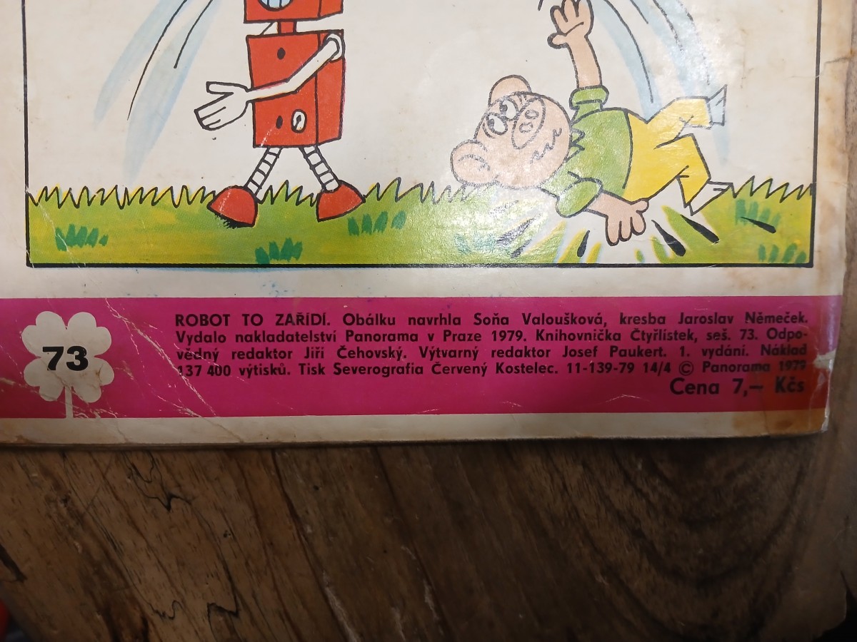 | Digitalizovaná tiráž: | минтик MA 73 AA44 ROBOT TO ZAŘÍDÍ. Obálku navrhla Soňa Valoušková, kresba Jaroslav Němeček. Vydalo nakladatelství Panorama v Praze 1979. Knihovnička Čtyřlístek, seš. 73. Odpo- vědný redaktor Jiří Čehovský. Výtvarný redaktor Josef Paukert. 1. vydání. Náklad 137 400 výtisků. Tisk Severografia Červený Kostelec. 11-139-79 14/4 Panorama 1979 Cena 7,- Kčs |