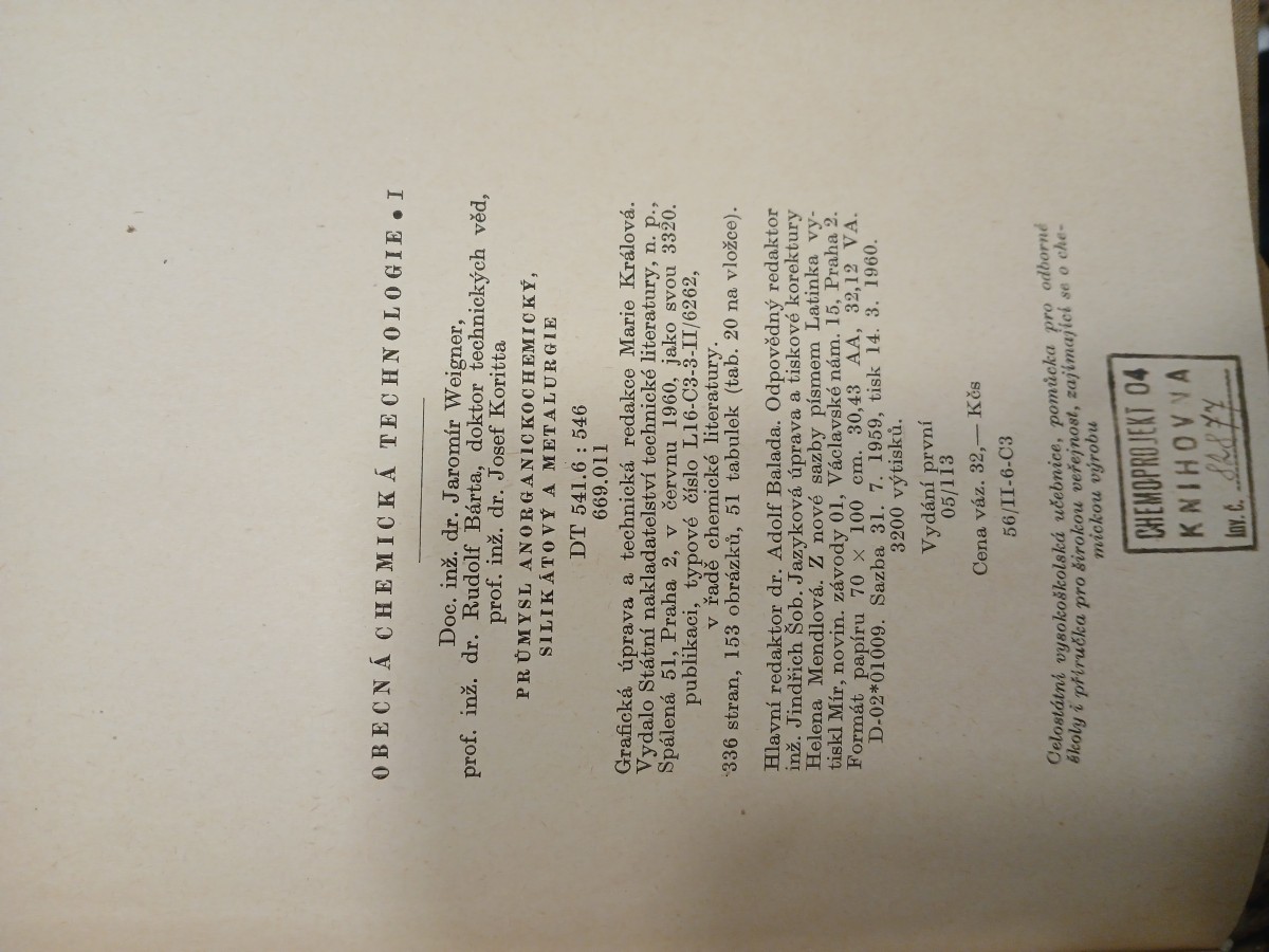 | Digitalizovaná tiráž: | OBECNÁ CHEMICKÁ TECHNOLOGIE I Doc. inž. dr. Jaromír Weigner, prof. inž. dr. Rudolf Bárta, doktor technických věd, prof. inž. dr. Josef Koritta PRŮMYSL ANORGANIC KOCHEMICKÝ, SILIKÁTOVÝ A METALURGIE DT 541.6 546 669.011 Grafická úprava a technická redakce Marie Králová. Vydalo Státní nakladatelství technické literatury, n. p., Spálená 51, Praha 2, v červnu 1960, jako svou 3320. publikaci, typové číslo L16-C3-3-II/6262, v řadě chemické literatury. 336 stran, 153 obrázků, 51 tabulek (tab. 20 na vložce). Hlavní redaktor dr. Adolf Balada. Odpovědný redaktor inž. Jindřich Šob. Jazyková úprava a tiskové korektury Helena Mendlová. Z nové sazby písmem Latinka vy- tiskl Mír, novin. závody 01, Václavské nám. 15, Praha 2. Formát papíru 70 x 100 cm. 30,43 AA, 32,12 VA. D-02*01009. Sazba 31. 7. 1959, tisk 14. 3. 1960. 3200 výtisků. Vydání první 05/113 Cena váz. 32,- Kčs 56/II-6-C3 Celostátní vysokoškolská učebnice, pomůcka pro odborné koly i příručka pro širokou veřejnost, zajímající se o che- mickou výrobu CHEMOPROJEKT 04 KNIHOVNA Any. C. 82877 |