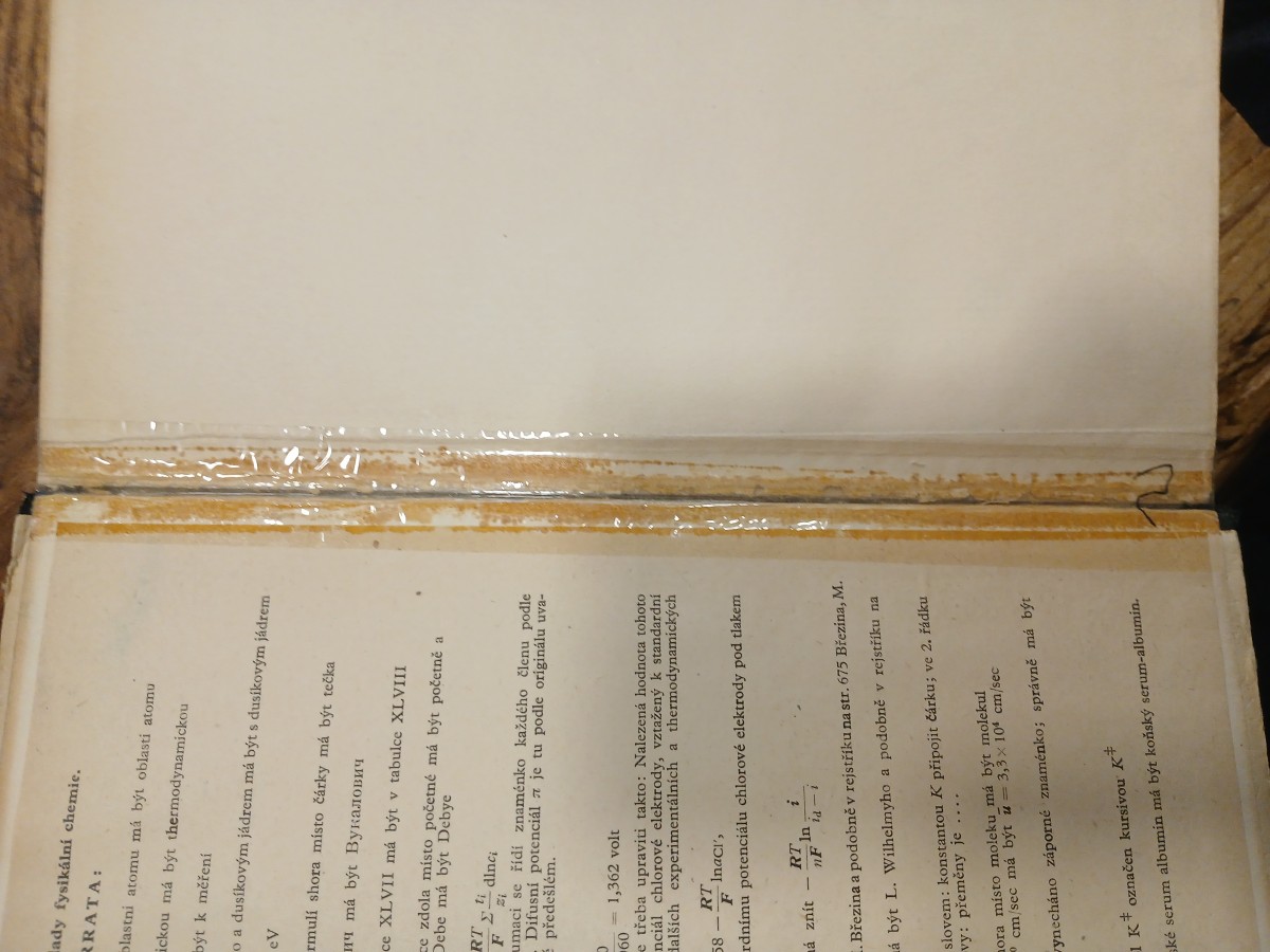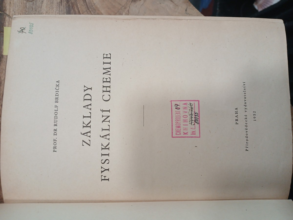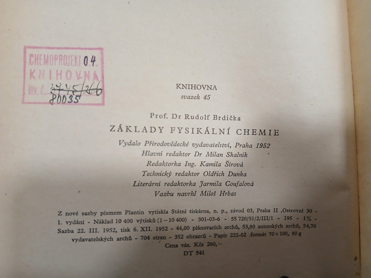 | Digitalizovaná tiráž: | CHEMOPROJEKT 0.4 KNIHOVNA Inv. C. 3745/266 80035 KNIHOVNA svazek 45 Prof. Dr Rudolf Brdička ZÁKLADY FYSIKÁLNÍ CHEMIE Vydalo Přírodovědecké vydavatelství, Praha 1952 Hlavní redaktor Dr Milan Skalník Redaktorka Ing. Kamila Šírová Technický redaktor Oldřich Dunka Literární redaktorka Jarmila Coufalová Vazbu navrhl Miloš Hrbas Z nové sazby písmem Plantin vytiskla Státní tiskárna, n. p., závod 03, Praha II,Ostrovní 30 - 55 720/51/2/III/1 - 195 - 1% - 1. vydání Náklad 10 400 výtisků (1-10 400) - 301-03-6 - Sazba 22. III. 1952, tisk 6. XII. 1952-44,00 plánovacích archů, 53,90 autorských archů, 54,70 vydavatelských archů - 704 stran - 352 obrazců - Papír 222-02 formát 70 x 100, 80 g Cena váz. Kčs 260,- DT 541 |