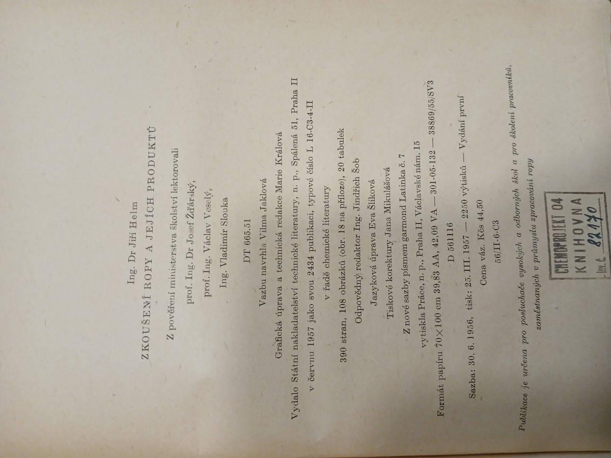 | Digitalizovaná tiráž: | Ing. Dr Jiří Helm ZKOUŠENÍ ROPY A JEJÍCH PRODUKTŮ Z pověření ministerstva školství lektorovali prof. Ing. Dr Josef Žďárský, prof. Ing. Václav Veselý, Ing. Vladimír Slouka DT 665.51 Vazbu navrhla Vilma Jaklová Grafická úprava a technická redakce Marie Králová Vydalo Státní nakladatelství technické literatury, n. p., Spálená 51, Praha II v červnu 1957 jako svou 2434 publikaci, typové číslo L 16-C3-4-II v řadě chemické literatury 390 stran, 108 obrázků (obr. 18 na příloze), 20 tabulek Odpovědný redaktor Ing. Jindřich Sob Jazyková úprava Eva Šliková Tiskové korektury Jana Mikulášová Z nové sazby písmem garmond Latinka č. 7 vytiskla Práce, n. p., Praha II, Václavské nám. 15 Formát papíru 70x100 cm 39,83 AA, 42,09 VA-301-05-132-38869/55/SV3 D 561116 Sazba: 30. 6. 1956, tisk: 25. III. 1957-2250 výtisků - Vydání první Cena váz. Kčs 44,50 56/II-6-C3 Publikace je určena pro posluchače vysokých a odborných škol a pro školení pracovníků, zaměstnaných v průmyslu zpracování ropy CHEMOPROJEKT 04 KNIHOVNA 82170 |
