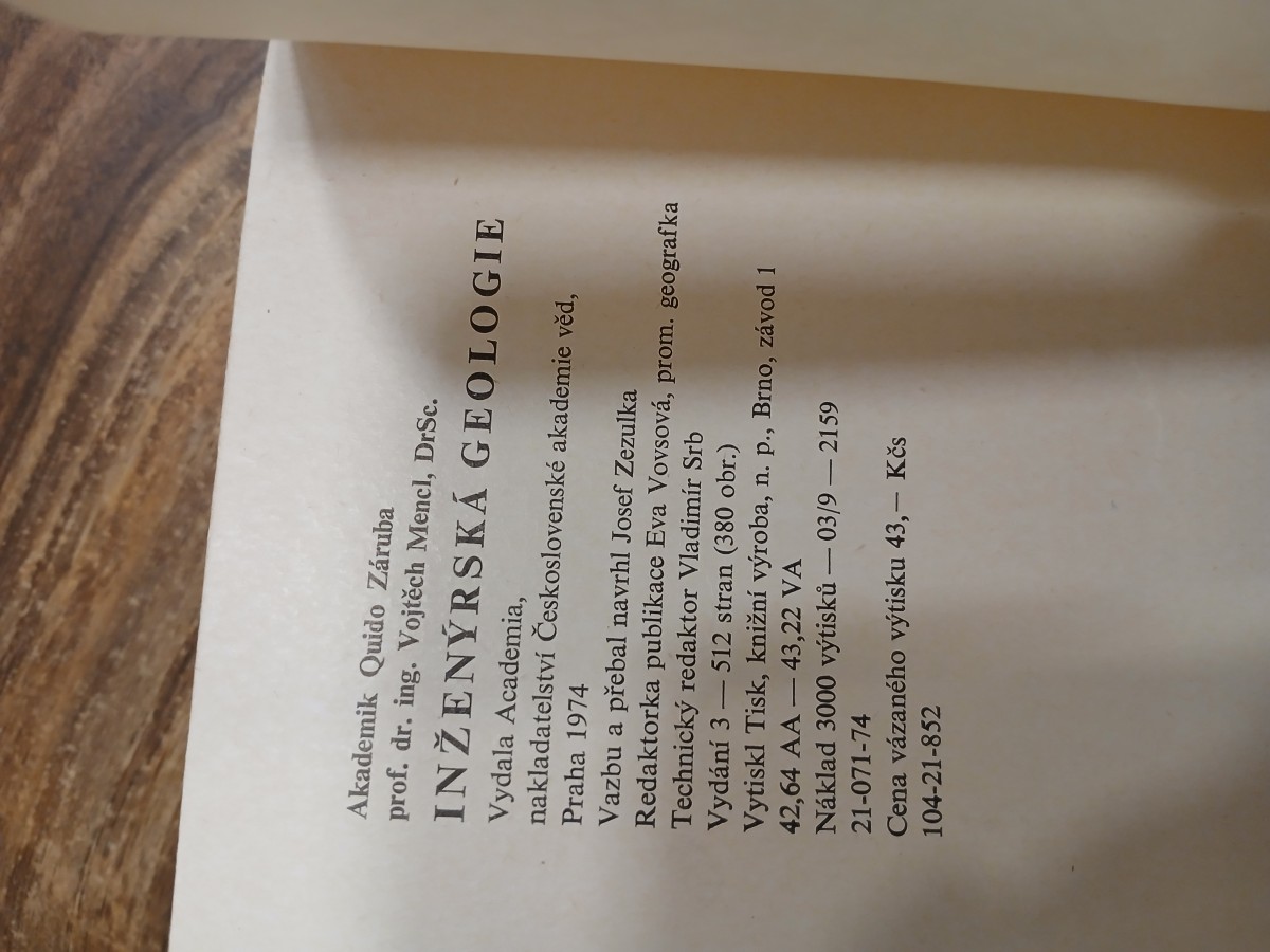 | Digitalizovaná tiráž: | Akademik Quido Záruba prof. dr. ing. Vojtěch Mencl, DrSc. INŽENÝRSKÁ GEOLOGIE Vydala Academia, nakladatelství Československé akademie věd, Praha 1974 Vazbu a přebal navrhl Josef Zezulka Redaktorka publikace Eva Vovsová, prom. geografka Technický redaktor Vladimír Srb Vydání 3 - 512 stran (380 obr.) Vytiskl Tisk, knižní výroba, n. p., Brno, závod 1 42,64 AA 43,22 VA Náklad 3000 výtisků - 03/9 - 2159 21-071-74 Cena vázaného výtisku 43,- Kčs 104-21-852 |