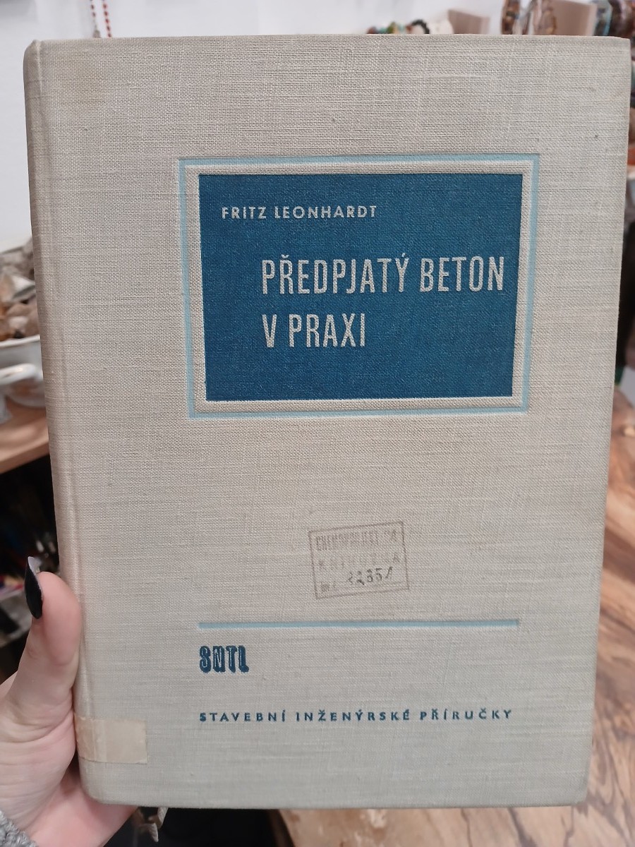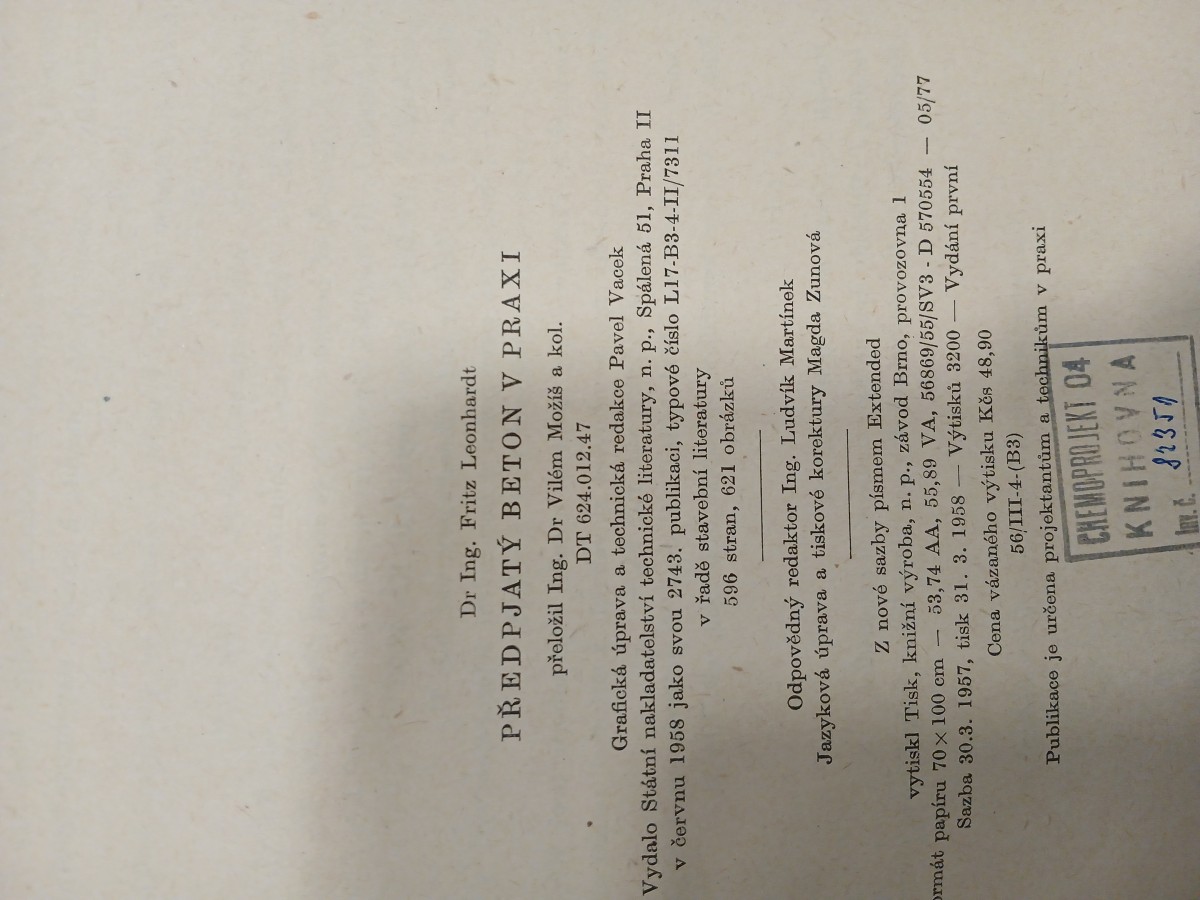 | Digitalizovaná tiráž: | Dr Ing. Fritz Leonhardt PŘEDPJATÝ BETON V PRAXI přeložil Ing. Dr Vilém Možíš a kol. DT 624.012.47 Grafická úprava a technická redakce Pavel Vacek Vydalo Státní nakladatelství technické literatury, n. p., Spálená 51, Praha II v červnu 1958 jako svou 2743. publikaci, typové číslo L17-B3-4-II/7311 v řadě stavební literatury 596 stran, 621 obrázků Odpovědný redaktor Ing. Ludvík Martínek Jazyková úprava a tiskové korektury Magda Zunová Z nové sazby písmem Extended ormát papíru 70 x 100 cm - vytiskl Tisk, knižní výroba, n. p., závod Brno, provozovna 1 53,74 AA, 55,89 VA, 56869/55/SV3 - D 570554 Sazba 30.3. 1957, tisk 31. 3. 1958- Výtisků 3200- Vydání první Cena vázaného výtisku Kčs 48,90 56/III-4-(B3) Publikace je určena projektantům a technikům v praxi CHEMOPROJEKT 04 KNIHOVNA 82351 05/77 |