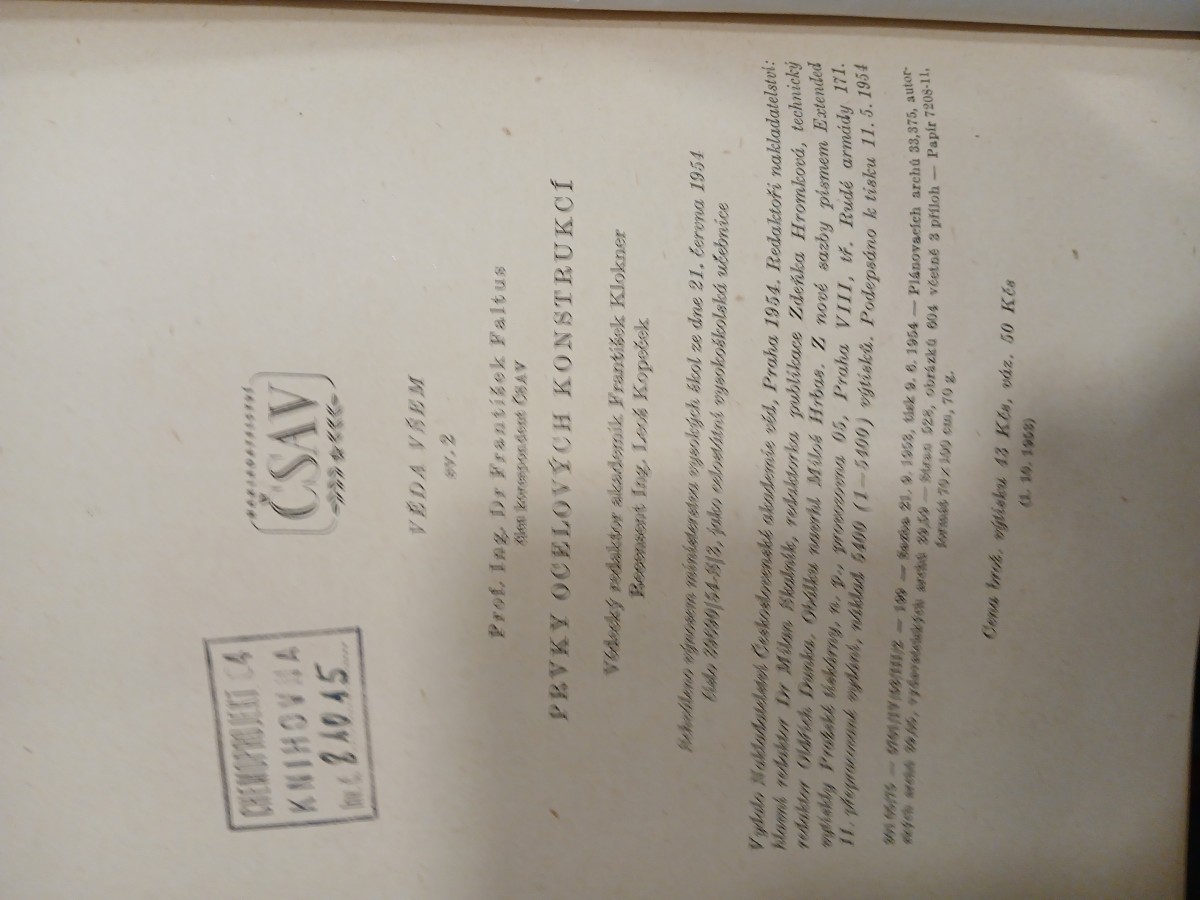 | Digitalizovaná tiráž: | CHEMOPROJEKT C4 KNIHOVNA 24045 CSAV VEDA VREM ev.2 Prof. Ing, Dr Frantisek Faltus Glen korepondent CBAV PRVKY OCELOVÝCH KONSTRUKCÍ Vedecký redaktor akademik František Klokner Recensent Ing. Leok Kopeček Bekleno ognosem ministersten vysokých kol ze dne 21. června 1954 Cielo 28880154-8512, jako celostátní vysokoškolská učebnice Vydalo Nakladatele Ceskoslovenské akademie véd, Praha 1954. Redaktoři nakladatelství: hlavni redaktor Dr Milan Skalnik, redaktorka publikace Zdenka Hromková, technický redaktor Oldrich Dunks, Obálku navrhl Miloš Hrbas. Z nové sazby pismem Extended mylishly Protaké tiskárny, n. p., promossena 05, Praha VIII, tř. Rudé armády 171. 11. hegazmak wynt, náklad 5400 (1-5409) výtisků. Podepsáno k tisku 11.5.1954 195/75-7/8/11/2-199-21. 9. 1958, tiek 9. 6. 1954 - Plánovacích archú 33,375, autor dých sech U*, vydavatelských arch 39,59-Stran 528, obrázků 604 včetně 3 příloh - Papír 7208-11, formás 70x100 cm, 70 g. Cena brož, výtisku 42 Kés, váz. 50 Kés (1.19. 1958) |