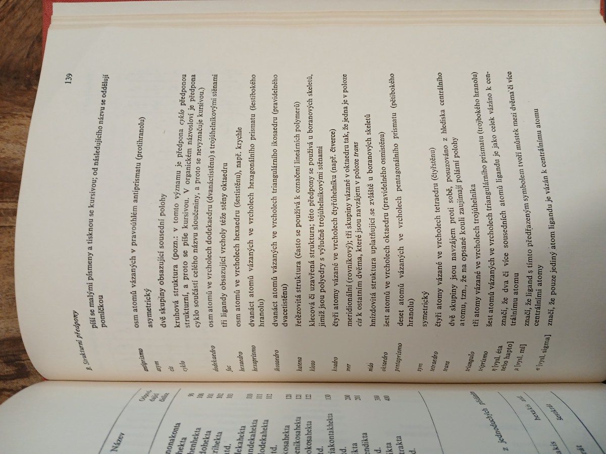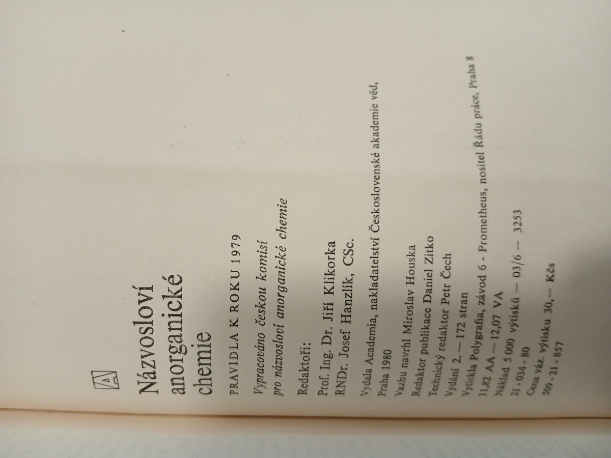 | Digitalizovaná tiráž: | Názvosloví anorganické chemie PRAVIDLA K ROKU 1979 Vypracováno českou komisi pro názvosloví anorganické chemie Redaktoři: Prof. Ing. Dr. Jiří Klikorka RNDr. Josef Hanzlík, CSc. Vydala Academia, nakladatelství Československé akademie věd, Praha 1980 Vazbu navrhl Miroslav Houska Redaktor publikace Daniel Zitko Technický redaktor Petr Čech Vydání 2.-172 stran Vytiskla Polygrafia, závod 6 - Prometheus, nositel Řádu práce, Praha 8 11,82 AA-12,07 VA Náklad 5000 výtisků - 03/6 - 3253 21-034-80 Cena váz. výtisku 30,- Kčs 509-21-857 |