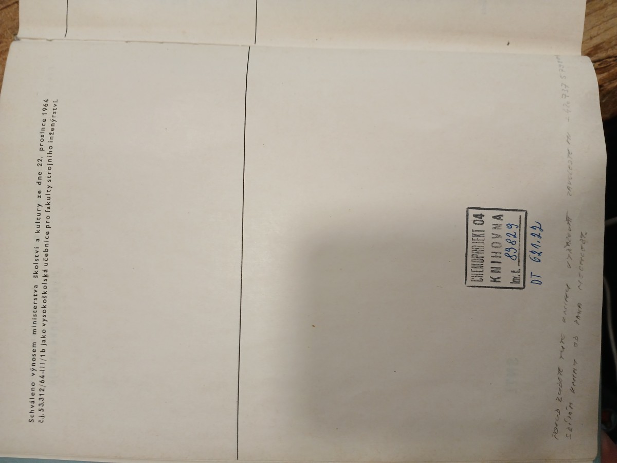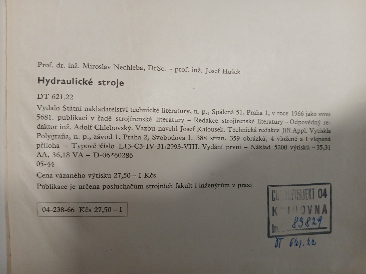 | Digitalizovaná tiráž: | Prof. dr. inž. Miroslav Nechleba, DrSc. - prof. inž. Josef Hušek Hydraulické stroje DT 621.22 - Vydalo Státní nakladatelství technické literatury, n. p., Spálená 51, Praha 1, v roce 1966 jako svou 5681. publikaci v řadě strojírenské literatury Redakce strojírenské literatury - Odpovědný re- daktor inž. Adolf Chlebovský. Vazbu navrhl Josef Kalousek. Technická redakce Jiří Appl. Vytiskla Polygrafia, n. p., závod 1, Praha 2, Svobodova 1. 388 stran, 359 obrázků, 4 vložené a 1 vlepená příloha Typové číslo L13-C3-IV-31/2993-VIII. Vydání první - Náklad 5200 výtisků - 35,31 AA, 36,18 VA - D-06*60286 05-44 Cena vázaného výtisku 27,50 - I Kčs Publikace je určena posluchačům strojních fakult i inženýrům v praxi 04-238-66 Kčs 27,50 - I CHUSJEKT 04 KOVNA 83829 DT 621.22 |