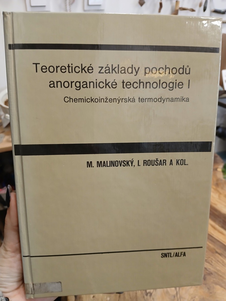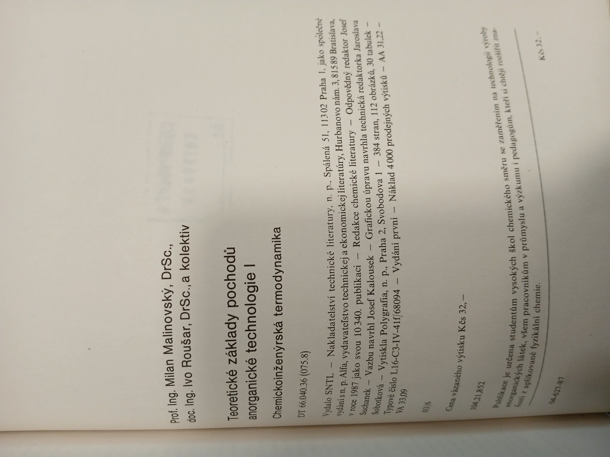 | Digitalizovaná tiráž: | Prof. Ing. Milan Malinovský, DrSc., doc. Ing. Ivo Roušar, DrSc., a kolektiv Teoretické základy pochodů anorganické technologie I Chemickoinženýrská termodynamika DT 66.040.36 (075.8) Vydalo SNTL - Nakladatelství technické literatury, n. p.. Spálená 51, 11302 Praha 1. jako společné vydaní sn. p. Alfa, vydavateľstvo technickej a ekonomickej literatúry, Hurbanovo nám. 3, 815 89 Bratislava, V roce 1987 jako svou 10340. publikaci - Redakce chemické literatury - Odpovědný redaktor Josef Vytiskla Polygrafia, n. p., Praha 2, Svobodova 1 - 384 stran, 112 obrázků, 30 tabulek - Suchanek - Vazbu navrhl Josef Kalousek - Grafickou úpravu navrhla technická redaktorka Jaroslava - Náklad 4000 prodejných výtisků - AA 31,22 - Typové číslo L16-C3-IV-41f/68094 Sobotková VA 33,09 036 Cena vázaného výtisku Kčs 32,- 104.21.852 1 Vydání první anorganických látek, všem pracovníkům v průmyslu a výzkumu i pedagogům, kteří si chtějí rozšířit zna- Publikace je určena studentům vysokých škol chemického směru se zaměřením na technologii výroby fosti z aplikované fyzikální chemie. 04-627-87 K&32.- |