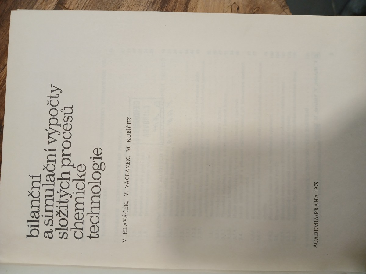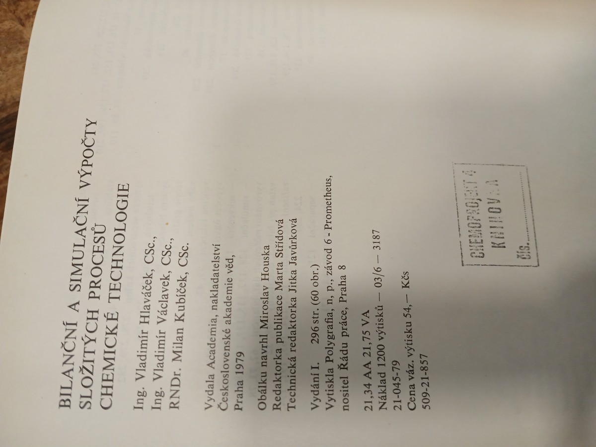 | Digitalizovaná tiráž: | BILANČNÍ A SIMULAČNÍ VÝPOČTY SLOŽITÝCH PROCESŮ CHEMICKÉ TECHNOLOGIE Ing. Vladimír Hlaváček, CSc., Ing. Vladimír Václavek, CSc., RNDr. Milan Kubíček, CSc. Vydala Academia, nakladatelství Československé akademie věd, Praha 1979 Obálku navrhl Miroslav Houska Redaktorka publikace Marta Střídová Technická redaktorka Jitka Javůrková Vydání I. 296 str. (60 obr.) Vytiskla Polygrafia, n, p., závod 6 - Prometheus, nositel Řádu práce, Praha 8 21,34 AA 21,75 VA Náklad 1200 výtisků - 03/6-3187 21-045-79 Cena váz. výtisku 54,- Kčs 509-21-857 CHEMOPROJEKT 4 KNINOVAA čís. |