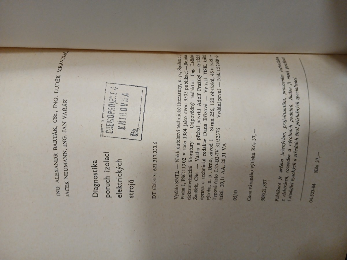 | Digitalizovaná tiráž: | JACEK NEUMANN, ING. JAN VAŘÁK ING. ALEXANDR BARTÁK, CSc., ING. LUDĚK MRAVINAC Diagnostika poruch izolací elektrických strojů CHELSOPROJEKT4 KNIHOVNA CIS. DT 621.313: 621.317.333.6 Vydalo SNTL - Nakladatelství technické literatury, n. p., Spálená 51, Praha 1, PSČ 11302 v roce 1984 jako svou 9505 publikaci-Redak elektrotechnické literatury Odpovědný redaktor Ing. Ladislav Ženíšek, CSc.- Vazbu a přebal navrhl Adolf Pražský - Grafick úprava a technická redakce Dana Břízová - Vytiskl TISK, knižni výroba, n. p., Brno, závod 1 - Stran 256, 120 obrázků, 46 tabulek Typové číslo L25-B3-IV-31/52376 - Vydání první - Náklad 2700 vý tisků. 20,11 AA, 20,31 VA 05/35 Cena vázaného výtisku Kčs 37,- 508/21,857 Publikace je určena inženýrům, projektantům, provozním technikum z elektráren, rozvoden a výrobních podniků. Budou ji moci poutat i studující vysokých a středních škol příslušných specializaci. 04-523-84 Kčs 37,- |