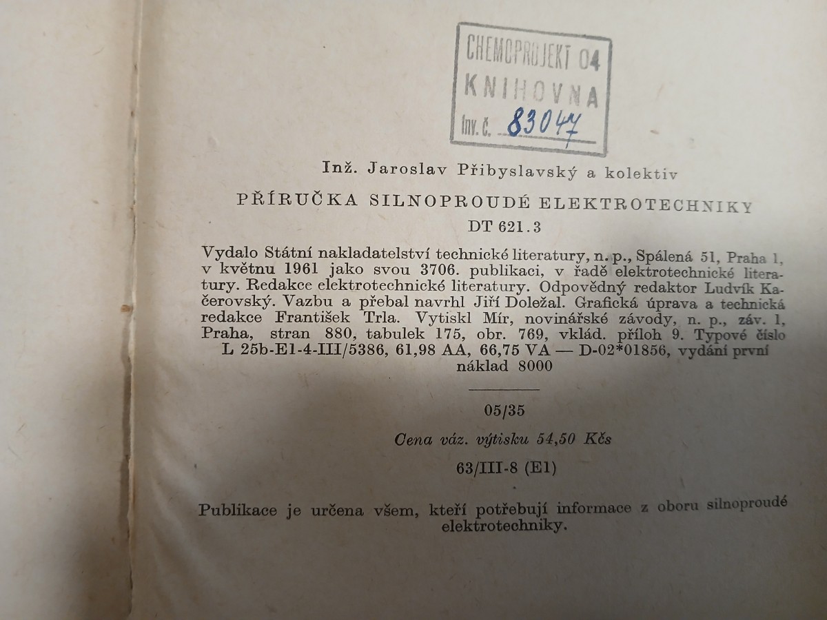 | Digitalizovaná tiráž: | CHEMOPROJEKT 04 KNIHOVNA v. c. 83044 Inž. Jaroslav Přibyslavský a kolektiv PŘÍRUČKA SILNOPROUDÉ ELEKTROTECHNIKY DT 621.3 Vydalo Státní nakladatelství technické literatury, n. p., Spálená 51, Praha 1, v květnu 1961 jako svou 3706. publikaci, v řadě elektrotechnické litera- tury. Redakce elektrotechnické literatury. Odpovědný redaktor Ludvík Ka- čerovský. Vazbu a přebal navrhl Jiří Doležal. Grafická úprava a technická redakce František Trla. Vytiskl Mír, novinářské závody, n. p., záv. 1, Praha, stran 880, tabulek 175, obr. 769, vklád. příloh 9. Typové číslo L 25b-E1-4-III/5386, 61,98 AA, 66,75 VA - D-02*01856, vydání první náklad 8000 05/35 Cena váz. výtisku 54,50 Kčs 63/III-8 (E1) Publikace je určena všem, kteří potřebují informace z oboru silnoproudé elektrotechniky. |