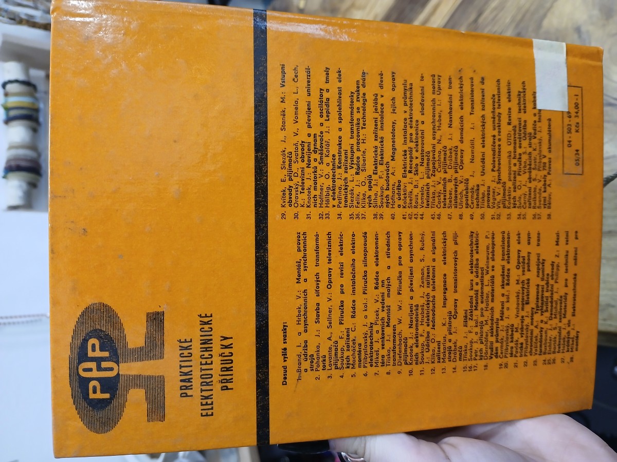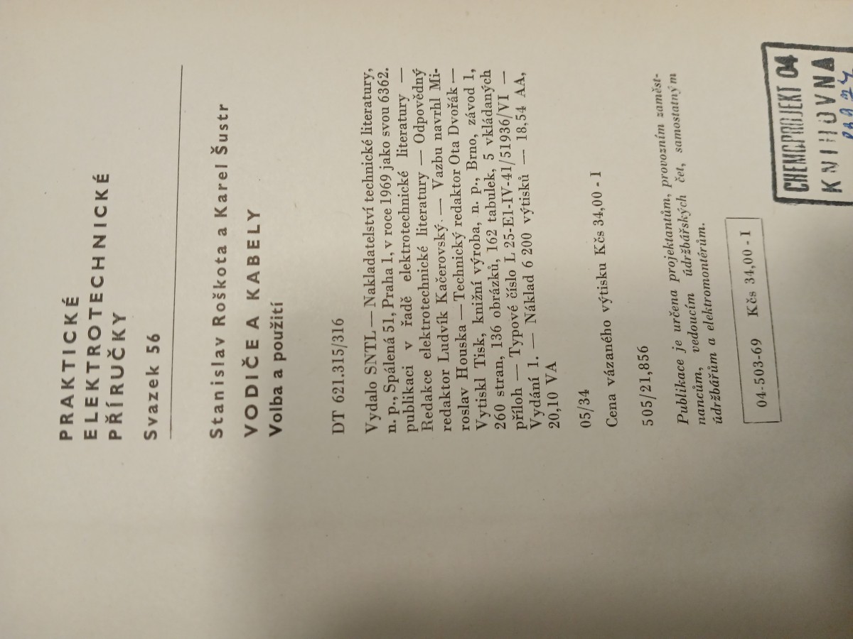 | Digitalizovaná tiráž: | PRAKTICKÉ ELEKTROTECHNICKÉ PŘÍRUČKY Svazek 56 Stanislav Roškota a Karel Šustr VODIČE A KABELY Volba a použití DT 621.315/316 Vydalo SNTL- Nakladatelství technické literatury, n. p., Spálená 51, Praha 1, v roce 1969 jako svou 6362. publikaci v řadě elektrotechnické literatury - Redakce elektrotechnické literatury - Odpovědný redaktor Ludvík Kačerovský. — Vazbu navrhl Mi- roslav Houska - Technický redaktor Ota Dvořák - Vytiskl Tisk, knižní výroba, n. p., Brno, závod 1, 260 stran, 136 obrázků, 162 tabulek, 5 vkládaných Typové číslo L 25-E1-IV-41/51936/VI příloh Vydání 1. — Náklad 6 200 výtisků 20,10 VA 05/34 - Cena vázaného výtisku Kčs 34,00 - I 505/21,856 - 18,54 AA, Publikace je určena projektantům, provozním zaměst- nancům, vedoucím údržbářských čet, samostatným údržbářům a elektromontérům. 04-503-69 Kěs 34,00 I CHEMCPOBJEKT 04 KNIHOVNA 234 |