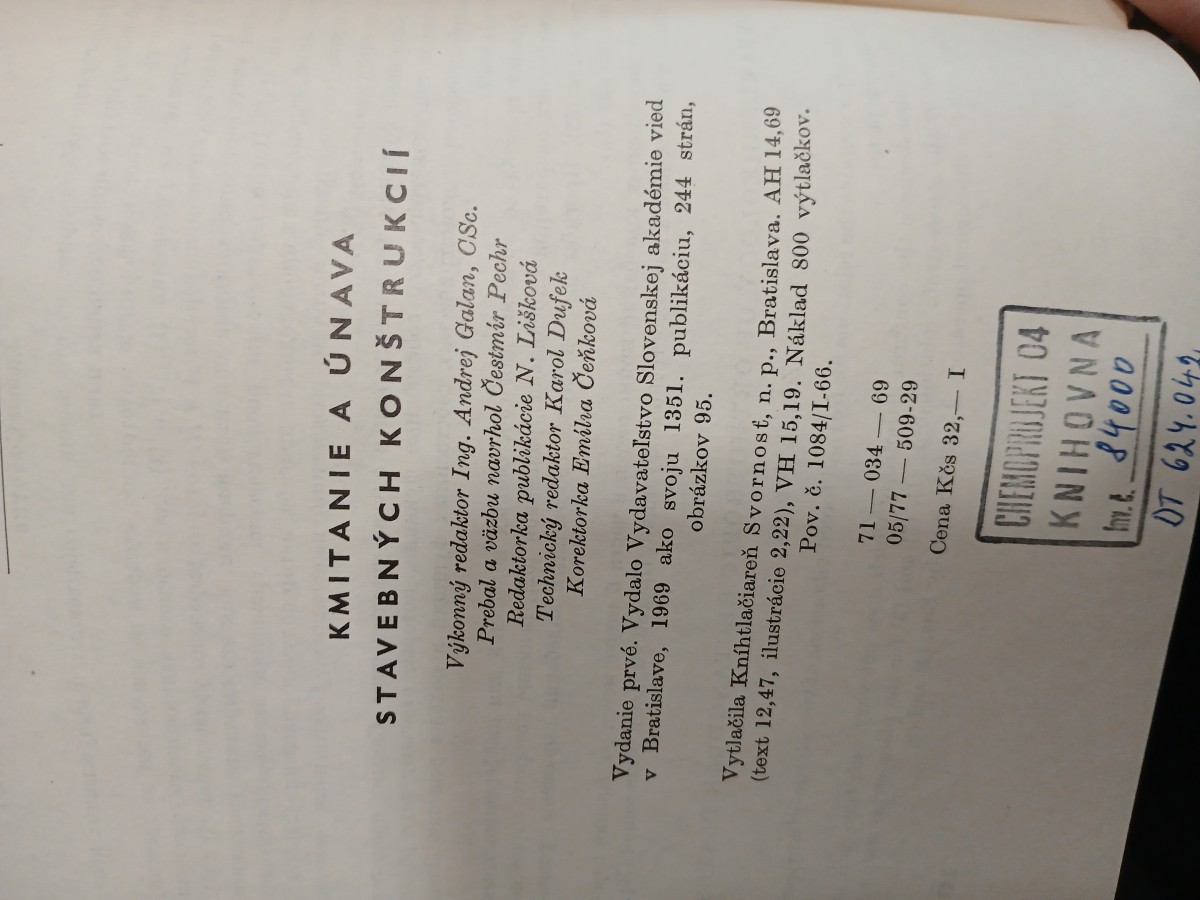 | Digitalizovaná tiráž: | KMITANIE A ÚNAVA STAVEBNÝCH KONŠTRUKCIÍ Výkonný redaktor Ing. Andrej Galan, CSc. Prebal a väzbu navrhol Čestmír Pechr Redaktorka publikácie N. Lišková Technický redaktor Karol Dufek Korektorka Emília Čeňková Vydanie prvé. Vydalo Vydavateľstvo Slovenskej akadémie vied v Bratislave, 1969 ako svoju 1351. publikáciu, 244 strán, obrázkov 95. Vytlačila Kníhtlačiareň Svornost, n. p., Bratislava. AH 14,69 (text 12,47, ilustrácie 2,22), VH 15,19. Náklad 800 výtlačkov. Pov. č. 1084/I-66. 71 034-69 05/77 509-29 Cena Kčs 32,- I CHEMOPROJEKT 04 KNIHOVNA Im. & 84000 Inv. DT 624.042 |