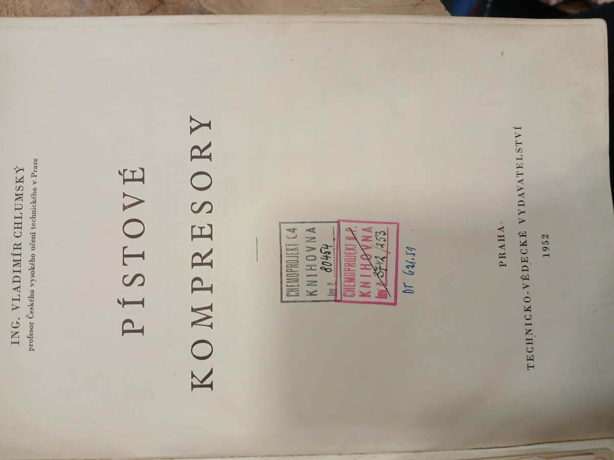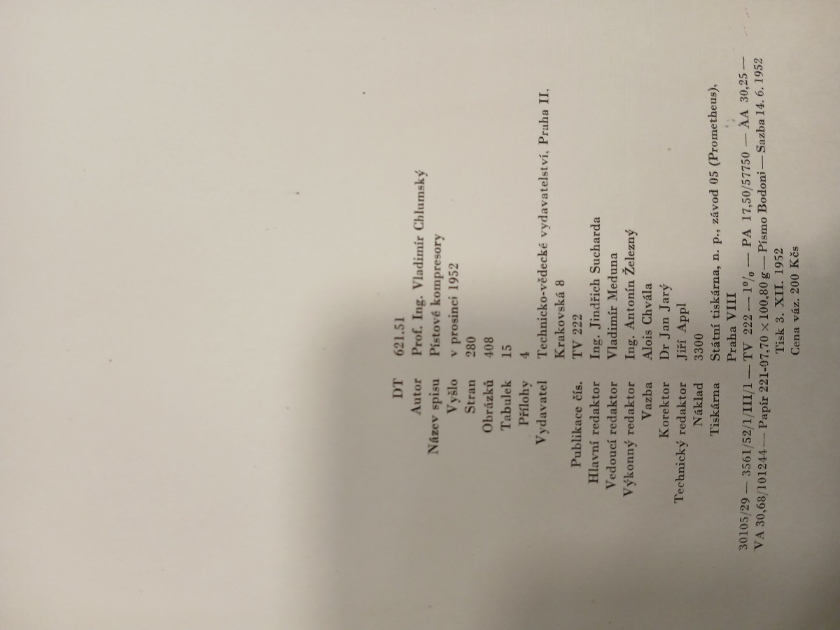 | Digitalizovaná tiráž: | DT Autor Název spisu 621.51 Prof. Ing. Vladimír Chlumský Pístové kompresory v prosinci 1952 Vyšlo Stran 280 Obrázků 408 Tabulek 15 Přílohy 4 Vydavatel Technicko-vědecké vydavatelství, Praha II, Publikace čís. Hlavní redaktor Vedoucí redaktor Výkonný redaktor Vazba Korektor Technický redaktor Tiskárna Náklad Krakovská 8 TV 222 Ing. Jindřich Sucharda Vladimír Meduna Ing. Antonín Zelezný Alois Chvála Dr Jan Jarý Jiří Appl 3300 Státní tiskárna, n. p., závod 05 (Prometheus), Praha VIII 30105/29-3561/52/1/III/1-TV 222-1% - PA 17,50/57750-AA 30,25- VA 30,68/101244- Papír 221-97,70 x 100,80 g- Písmo Bodoni - Sazba 14. 6. 1952 Tisk 3. XII. 1952 Cena váz. 200 Kčs |