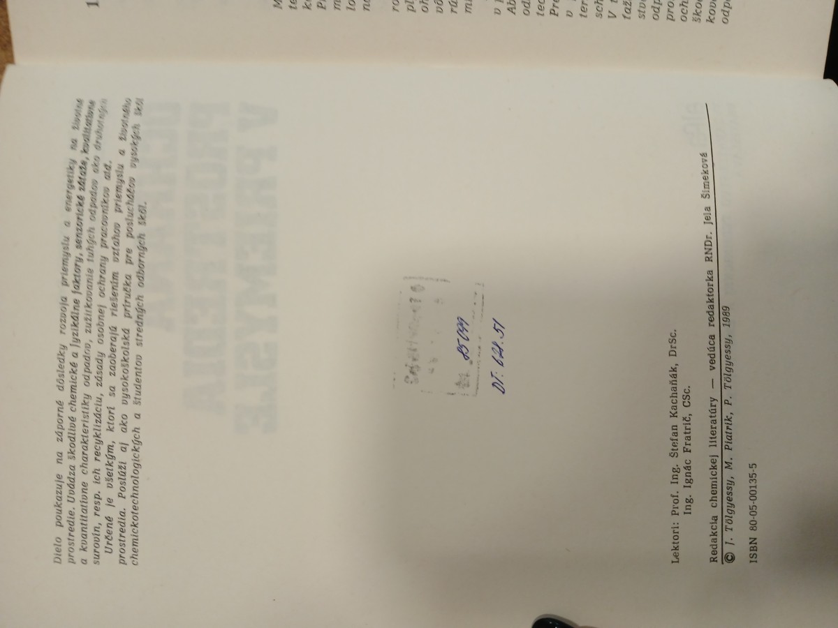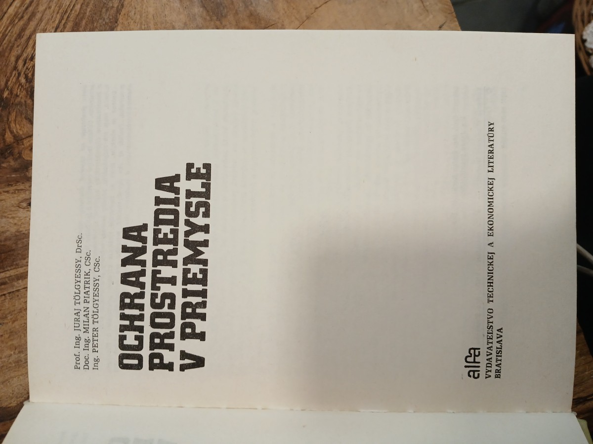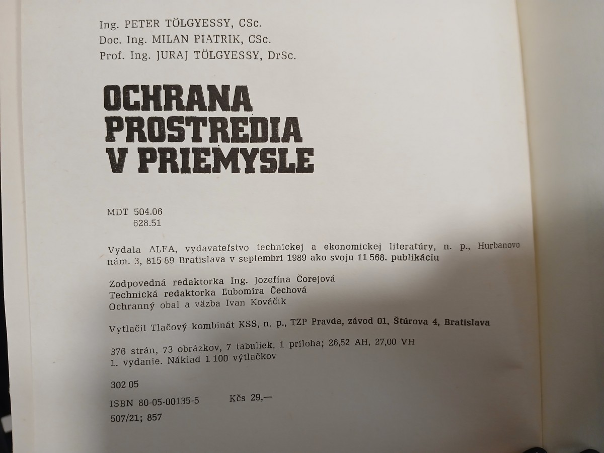 | Digitalizovaná tiráž: | Ing. PETER TÖLGYESSY, CSc. Doc. Ing. MILAN PIATRIK, CSc. Prof. Ing. JURAJ TÖLGYESSY, DrSc. OCHRANA PROSTREDIA V PRIEMYSLE MDT 504.06 628.51 Vydala ALFA, vydavateľstvo technickej a ekonomickej literatúry, n. p., Hurbanovo nám. 3, 815 89 Bratislava v septembri 1989 ako svoju 11 568. publikáciu Zodpovedná redaktorka Ing. Jozefína Čorejová Technická redaktorka Ľubomíra Čechová Ochranný obal a väzba Ivan Kováčik Vytlačil Tlačový kombinát KSS, n. p., TZP Pravda, závod 01, Štúrova 4, Bratislava 376 strán, 73 obrázkov, 7 tabuliek, 1 príloha; 26,52 AH, 27,00 VH 1. vydanie. Náklad 1 100 výtlačkov 302 05 ISBN 80-05-00135-5 Kčs 29,- 507/21; 857 |