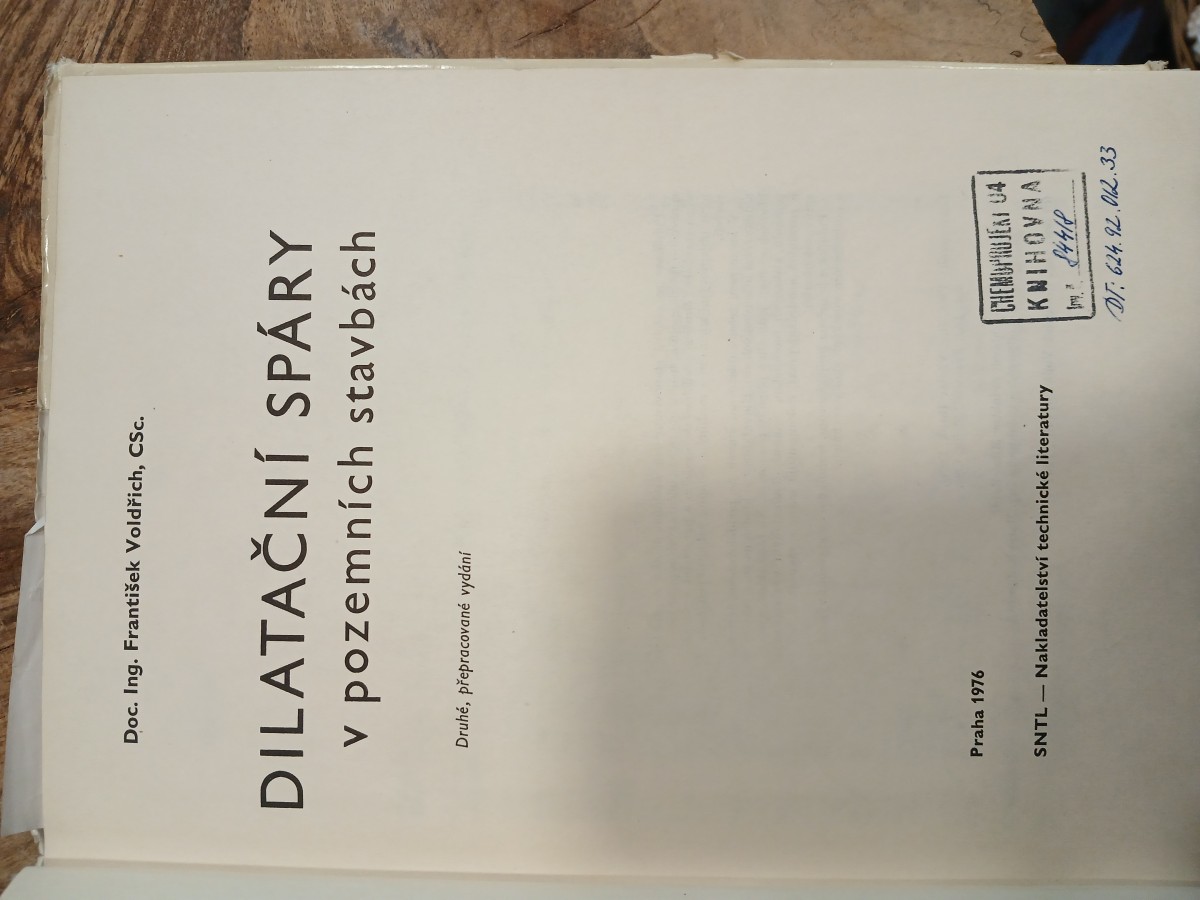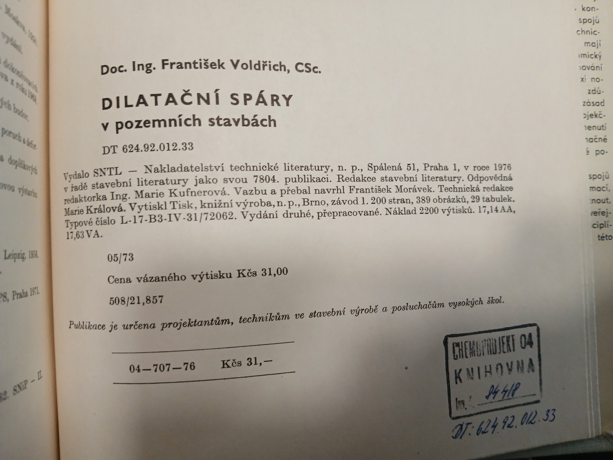 | Digitalizovaná tiráž: | . kon- spojú baluniomb yeh broden poruch & dele doplikoj ovou výstavbo Leipzig, 1956 P8, Praha 1971 SNP-IL Doc. Ing. František Voldřich, CSc. DILATAČNÍ SPÁRY v pozemních stavbách DT 624.92.012.33 Nakladatelství technické literatury, n. p., Spálená 51, Praha 1, v roce 1976 Vydalo SNTL - v řadě stavební literatury jako svou 7804. publikaci. Redakce stavební literatury. Odpovědná redaktorka Ing. Marie Kufnerová. Vazbu a přebal navrhl František Morávek. Technická redakce Marie Králová. Vytiskl Tisk, knižní výroba, n. p., Brno, závod 1. 200 stran, 389 obrázků, 29 tabulek. Typové číslo L-17-B3-IV-31/72062. Vydání druhé, přepracované. Náklad 2200 výtisků. 17,14 AA, 17,63 VA. 05/73 Cena vázaného výtisku Kčs 31,00 508/21,857 Publikace je určena projektantům, technikům ve stavební výrobě a posluchačům vysokých škol. 04-707-76 Kčs 31,- CHEMUPUJEKT 04 KNIHOVNA 84418 DT:62492.012.33 chnic- mají mický jování xi no- zdů- zásad ojekč- menutí načné € po- spojů mací, nout, veřej- ciplí- této |