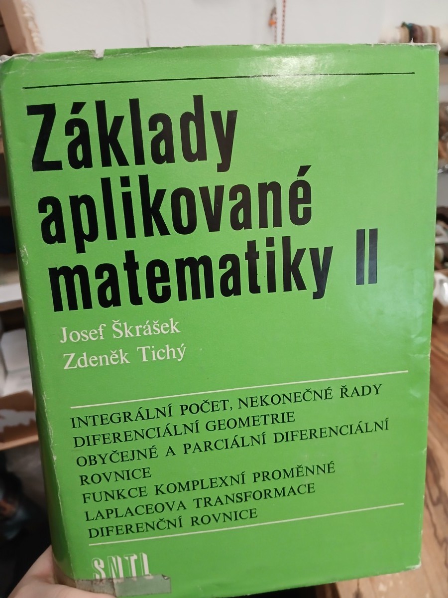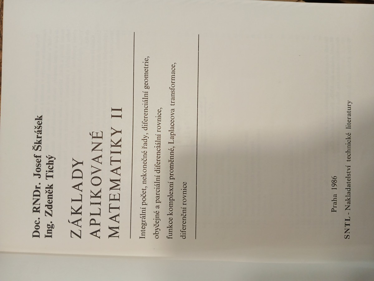 | Digitalizovaná tiráž: | Doc. RNDr. Josef Škrášek Ing. Zdeněk Tichý ZÁKLADY APLIKOVANÉ MATEMATIKY II Integrální počet, nekonečné řady, diferenciální geometrie, obyčejné a parciální diferenciální rovnice, funkce komplexní proměnné, Laplaceova transformace, diferenční rovnice DT 517.1/3 Vydalo SNTL - Nakladatelství technické literatury, n. p., Spálená 51, 113 02 Praha 1 v roce 1986 jako svou 9999. publikaci Odpovědný redaktor Ing. Milan Veselý Vazbu a přebal navrhl František Sodoma Technická redaktorka Jana Zehnulová Vytiskla Polygrafia, závod 6 - Prometheus, nositel Řádu práce, Praha 8 900 stran, 234 obrázků, 29 tabulek Typové číslo 11-B3-IV-51/52471. Vydání první Náklad 5000 prodejných výtisků. 63,89 AA, 68,45 VA 03/2 Cena vázaného výtisku Kčs 80,- 508/21,857 Publikace je určena posluchačům vysokých škol s technickým zaměřením, stejně jako technikům a inženýrům, jimž umožní získat potřebné matematické znalosti k řešení provozních a výzkumných problémů. Způsobem zpracování je vhodná pro samostatné studium. 04-513-86 Kčs 80,- |