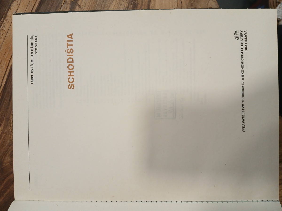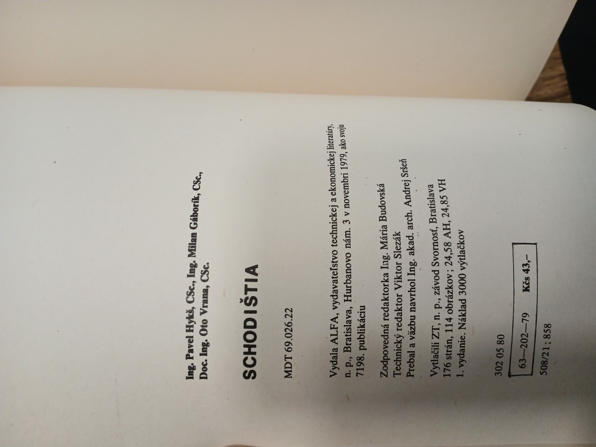 | Digitalizovaná tiráž: | Ing. Pavel Hykš, CSc., Ing. Milan Gáborík, CSc., Doc. Ing. Oto Vrana, CSc. SCHODIŠTIA MDT 69.026.22 Vydala ALFA, vydavateľstvo technickej a ekonomickej literatúry, n. p., Bratislava, Hurbanovo nám. 3 v novembri 1979, ako svoju 7198. publikáciu Zodpovedná redaktorka Ing. Mária Budovská Technický redaktor Viktor Slezák Prebal a väzbu navrhol Ing. akad. arch. Andrej Sršeň Vytlačili ZT, n. p., závod Svornosť, Bratislava 176 strán, 114 obrázkov; 24,58 AH, 24,85 VH 1. vydanie. Náklad 3000 výtlačkov 302 05 80 63-202-79 Kčs 43,- 508/21; 858 |