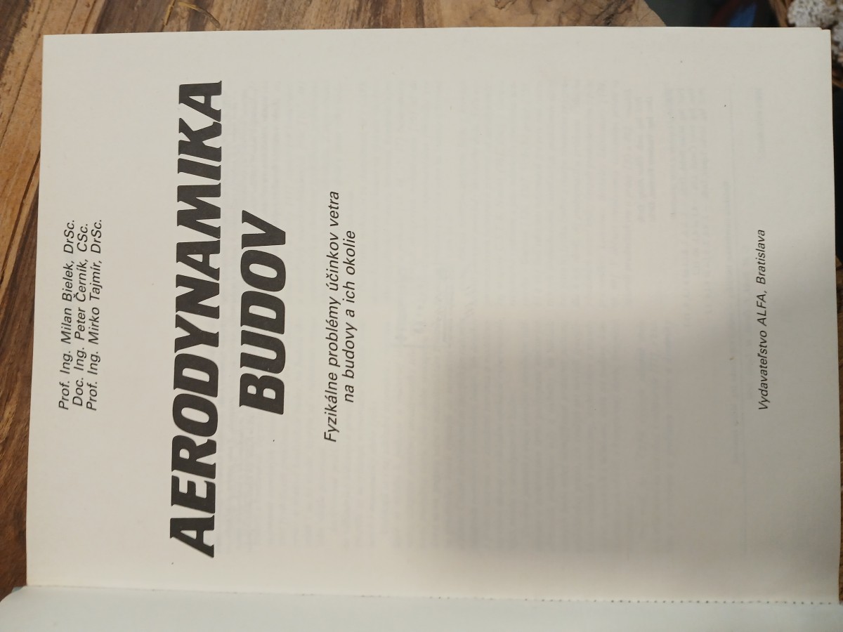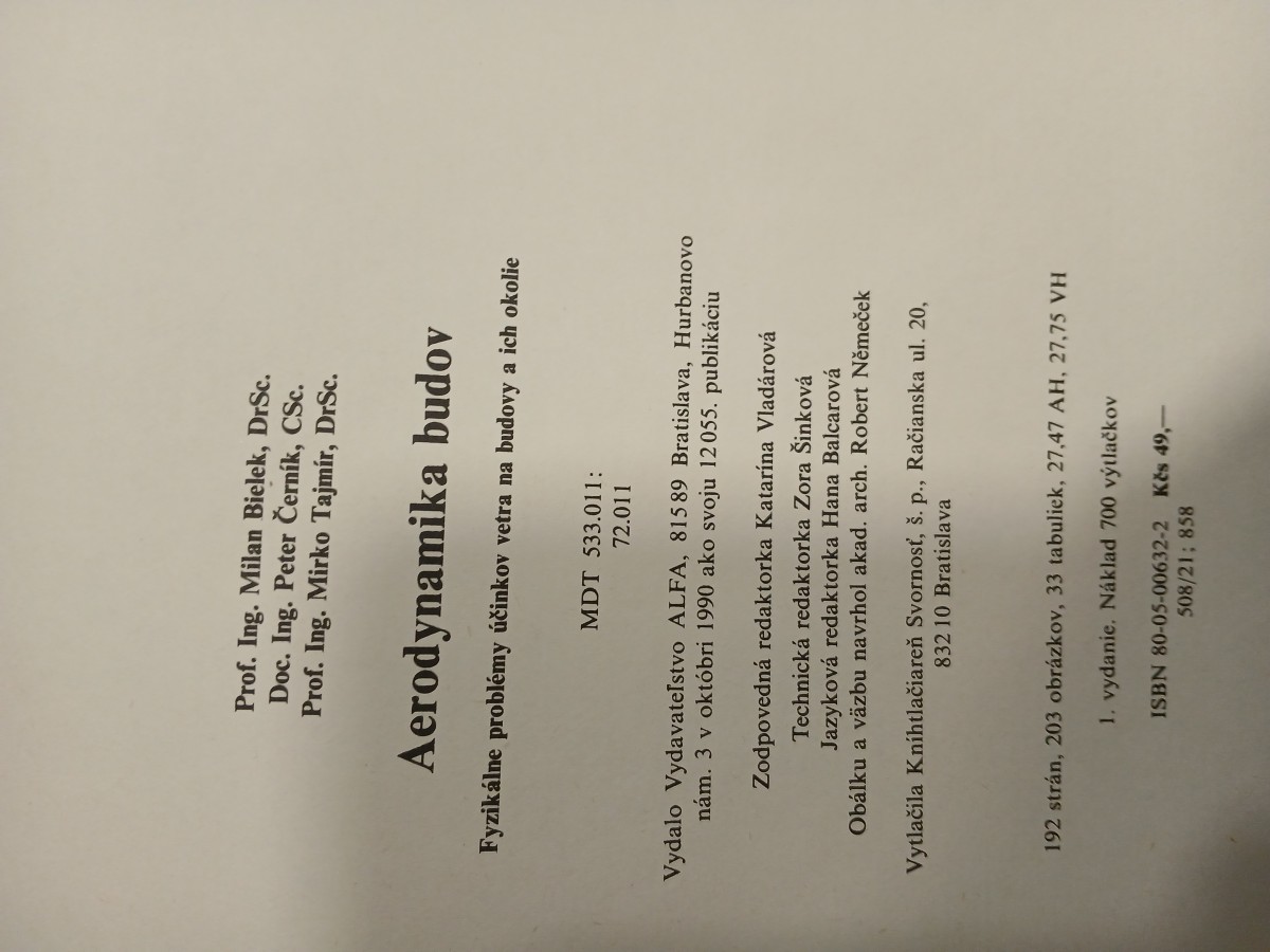 | Digitalizovaná tiráž: | Prof. Ing. Milan Bielek, DrSc. Doc. Ing. Peter Černík, CSc. Prof. Ing. Mirko Tajmir, DrSc. Aerodynamika budov Fyzikálne problémy účinkov vetra na budovy a ich okolie MDT 533.011: 72.011 Vydalo Vydavateľstvo ALFA, 81589 Bratislava, Hurbanovo nám. 3 v októbri 1990 ako svoju 12055. publikáciu Zodpovedná redaktorka Katarína Vladárová Technická redaktorka Zora Šinková Jazyková redaktorka Hana Balcarová Obálku a väzbu navrhol akad. arch. Robert Němeček Vytlačila Kníhtlačiareň Svornosť, š. p., Račianska ul. 20, 832 10 Bratislava 192 strán, 203 obrázkov, 33 tabuliek, 27,47 AH, 27,75 VH 1. vydanie. Náklad 700 výtlačkov ISBN 80-05-00632-2 Kčs 49,- 508/21; 858 |