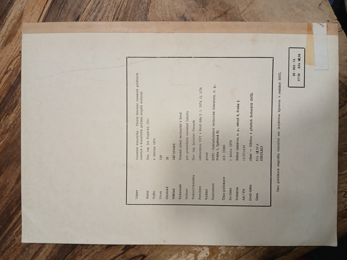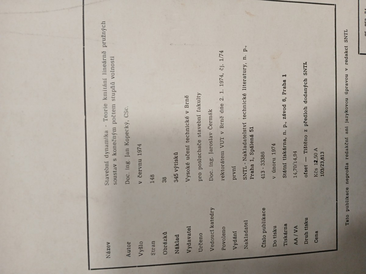 | Digitalizovaná tiráž: | Název Autor Vyšlo Stran Obrázků Náklad Vydavatel Určeno Vedoucí katedry Povoleno Vydání Nakladatel Číslo publikace Do tisku Tiskárna AA/VA Druh tisku Cena Stavební dynamika Teorie kmitání lineárně pružných soustav s konečným počtem stupňů volnosti Doc. Ing. Jan Kopecký, CSc. v červnu 1974 148 38 345 výtisků Vysoké učení technické v Brně pro posluchače stavební fakulty Doc. ing. Jaroslav Čermák rektorátem VUT v Brně dne 2. 1. 1974, čj. 1/74 první SNTL Nakladatelství technické literatury, n. p., Praha 1, Spálená 51 413-33386 v únoru 1974 Státní tiskárna, n. p., závod 6, Praha 1 14,70/14,94 ofset Tištěno z předloh dodaných SNTL Kčs 12,50 A 103/23,813 Tato publikace neprošla redakční ani jazykovou úpravou v redakci SNTL |