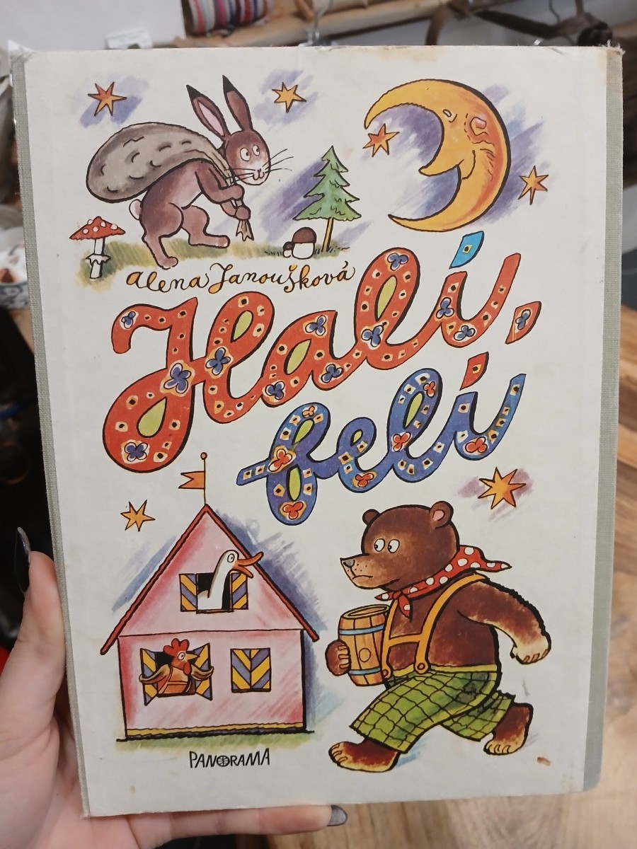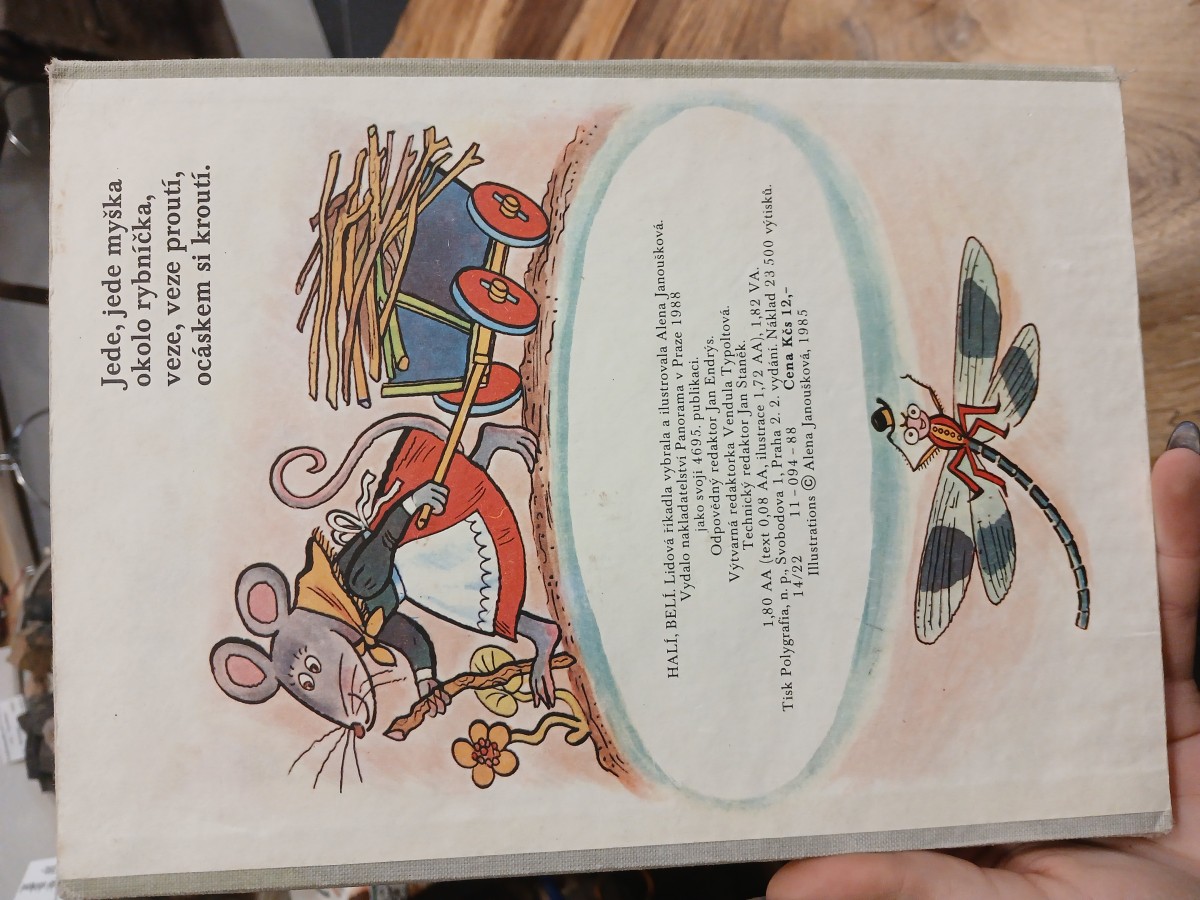 | Digitalizovaná tiráž: | HALÍ, BELÍ. Lidová říkadla vybrala a ilustrovala Alena Janoušková. Vydalo nakladatelství Panorama v Praze 1988 jako svoji 4695. publikaci. Odpovědný redaktor Jan Endrýs. Výtvarná redaktorka Vendula Typoltová. Technický redaktor Jan Staněk. 1,80 AA (text 0,08 AA, ilustrace 1,72 AA), 1,82 VA. 11 094 8.8 Tisk Polygrafia, n. p., Svobodova 1, Praha 2. 2. vydání. Náklad 23 500 výtisků. Cena Kčs 12,- Alena Janoušková, 1985 14/22 Illustrations |