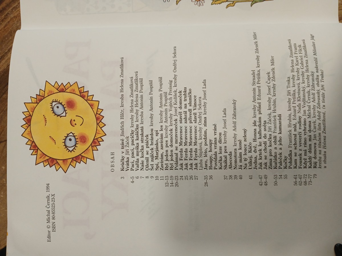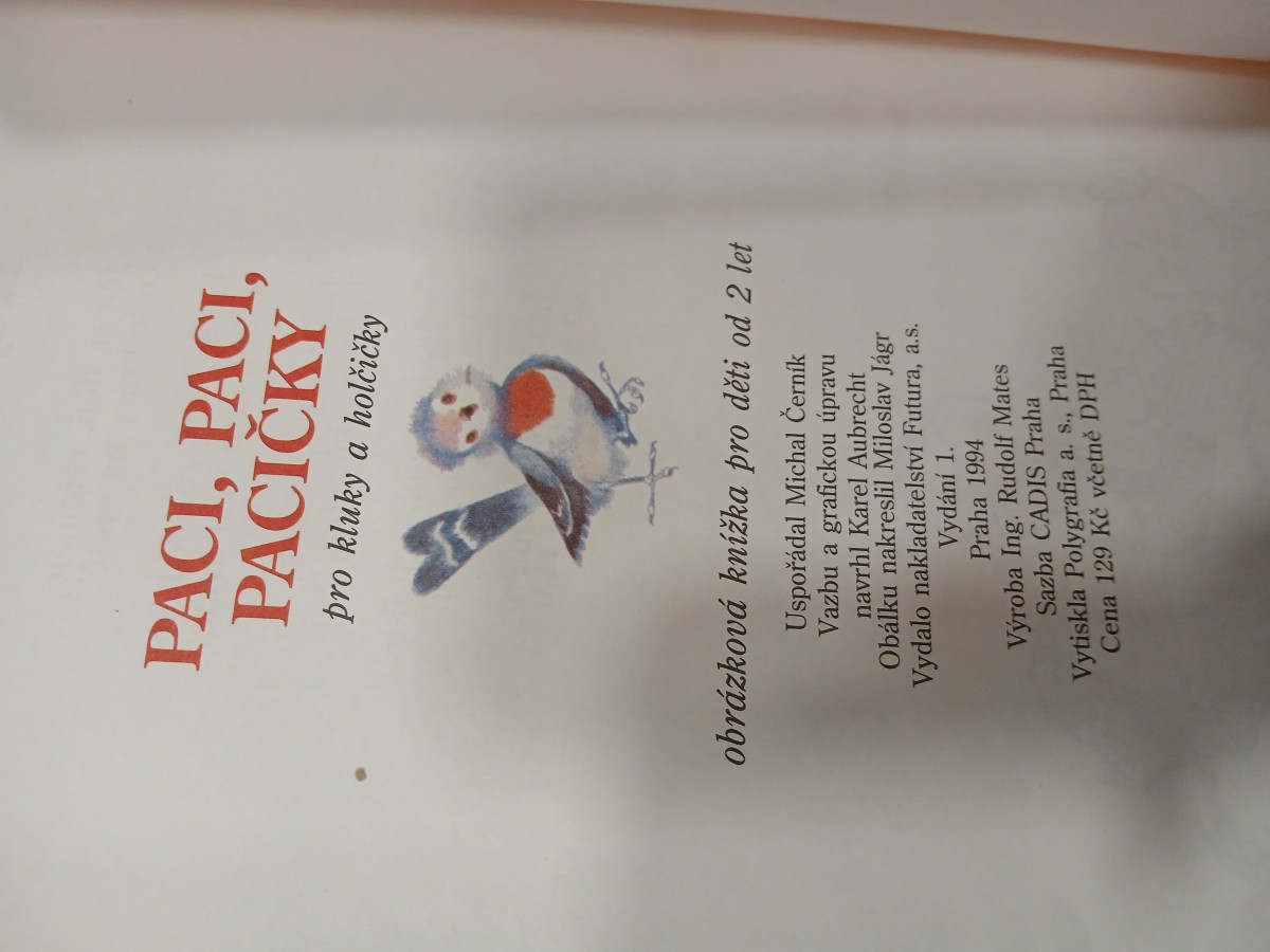 Digitalizovaná tiráž: PACI, PACI, PACIČKY pro kluky a holčičky obrázková knížka pro děti od 2 let Uspořádal Michal Černík Vazbu a grafickou úpravu navrhl Karel Aubrecht Obálku nakreslil Miloslav Jágr Vydalo nakladatelství Futura, a.s. Vydání 1. Praha 1994 Výroba Ing. Rudolf Mates Sazba CADIS Praha Vytiskla Polygrafia a. s., Praha Cena 129 Kč včetně DPH