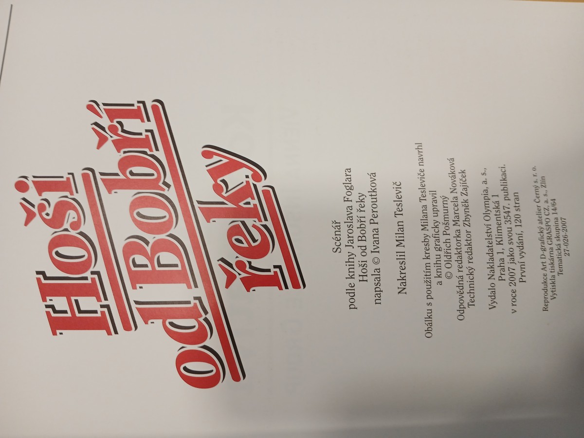 | Digitalizovaná tiráž: | Hoši od Bobří řeky Scénář podle knihy Jaroslava Foglara Hoši od Bobří řeky napsala Ivana Peroutková Nakreslil Milan Teslevič Obálku s použitím kresby Milana Tesleviče navrhl a knihu graficky upravil Oldřich Pošmurný Odpovědná redaktorka Marcela Nováková Technický redaktor Zbyněk Zajíček Vydalo Nakladatelství Olympia, a. s., Praha 1, Klimentská 1 v roce 2007 jako svou 3547. publikaci. První vydání, 120 stran Reprodukce Art D-grafický atelier Černý s. r. o. Vytiskla tiskárna GRASPO CZ, a. s., Zlín Tematická skupina 14/64 27-026-2007 |