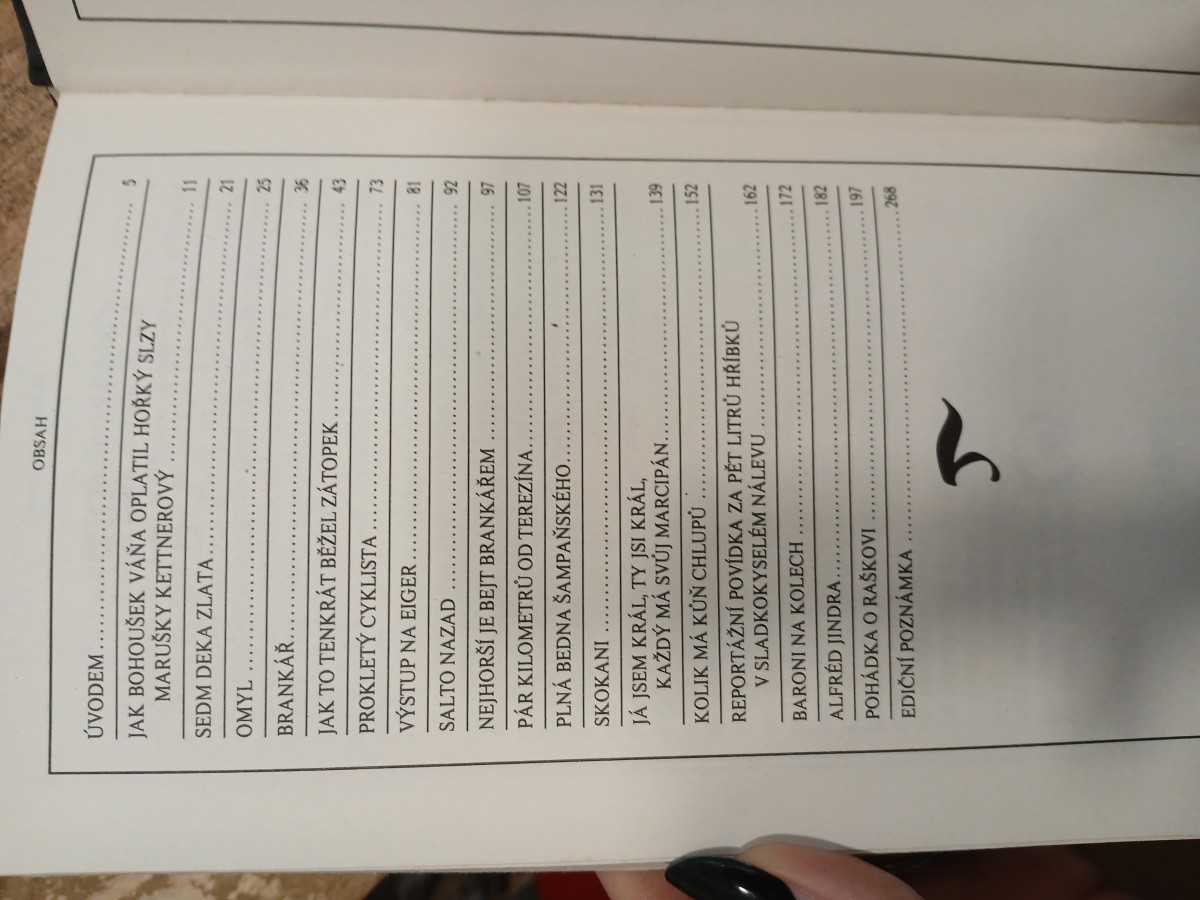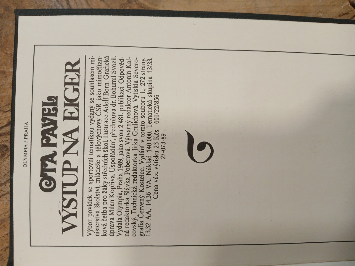 | Digitalizovaná tiráž: | OLYMPIA / PRAHA OTA PAVEL VÝSTUP NA EIGER Výbor povídek se sportovní tematikou vydaný se souhlasem mi- nisterstva školství, mládeže a tělovýchovy ČSR jako mimočítan- ková četba pro žáky středních škol. Ilustrace Adolf Born. Grafická úprava Milan Kopřiva. Uspořádání, předmluva dr. Bohumil Svozil. Vydala Olympia, Praha 1989, jako svou 2 481. publikaci. Odpověd- ná redaktorka Slávka Poberová. Výtvarný redaktor Antonín Kal- covský. Technická redaktorka Jitka Grulichová. Vytiskla Severo- grafia Červený Kostelec. Vydání v tomto souboru 1., 272 strany. 13,32 AA, 14,36 VA. Náklad 140 000. Tematická skupina 13/33. Cena váz. výtisku 23 Kčs 601/22/856 27-073-89 |