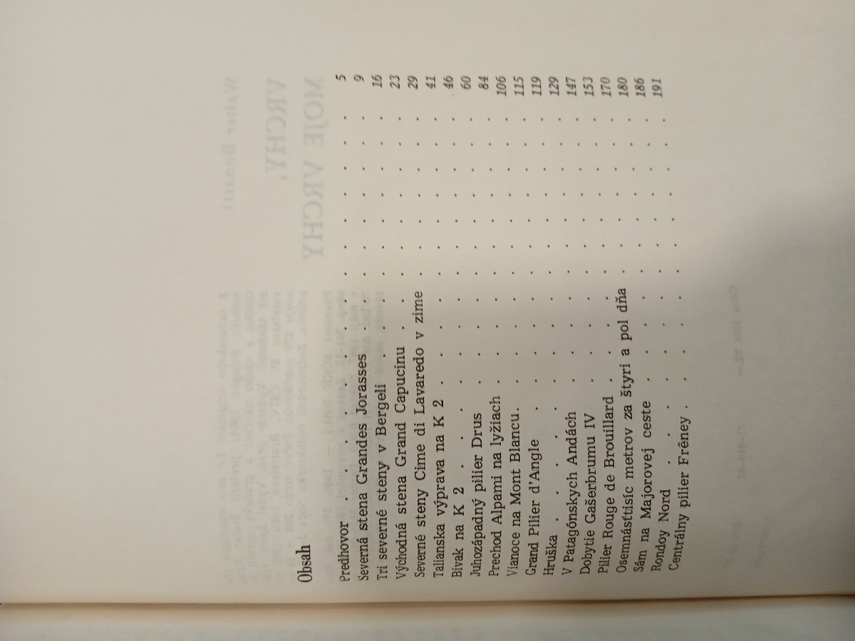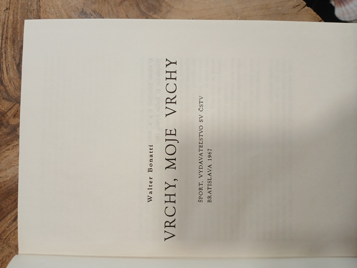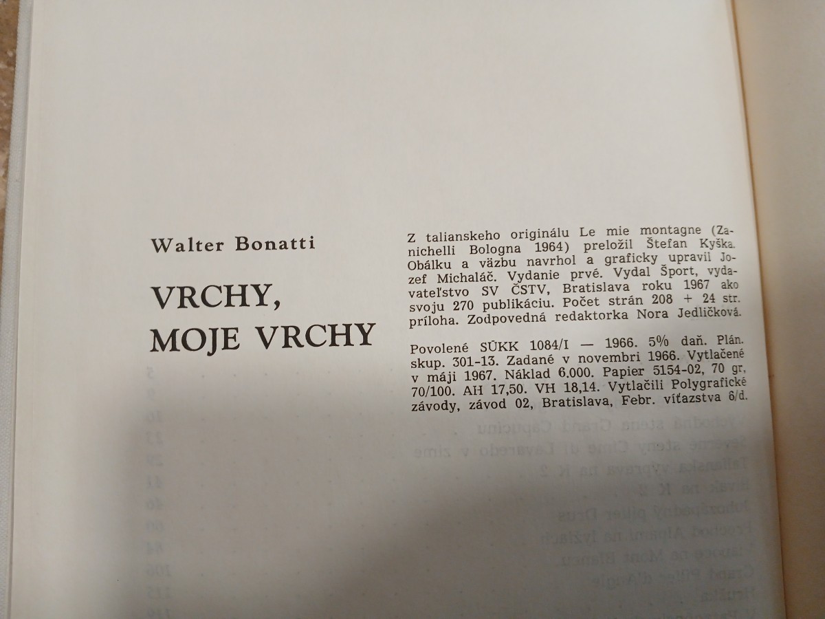 | Digitalizovaná tiráž: | Walter Bonatti VRCHY, MOJE VRCHY Z talianskeho originálu Le mie montagne (Za- nichelli Bologna 1964) preložil Štefan Kyška. Obálku a väzbu navrhol a graficky upravil Jo- zef Michaláč. Vydanie prvé. Vydal Sport, vyda- vateľstvo SV ČSTV, Bratislava roku 1967 ako svoju 270 publikáciu. Počet strán 208 + 24 str. príloha. Zodpovedná redaktorka Nora Jedličková. Povolené SŪKK 1084/I -1966. 5% daň. Plán. skup. 301-13. Zadané v novembri 1966. Vytlačené v máji 1967. Náklad 6.000. Papier 5154-02, 70 gr, 70/100. AH 17,50. VH 18,14. Vytlačili Polygrafické závody, závod 02, Bratislava, Febr. víťazstva 6/d. emis v obs |