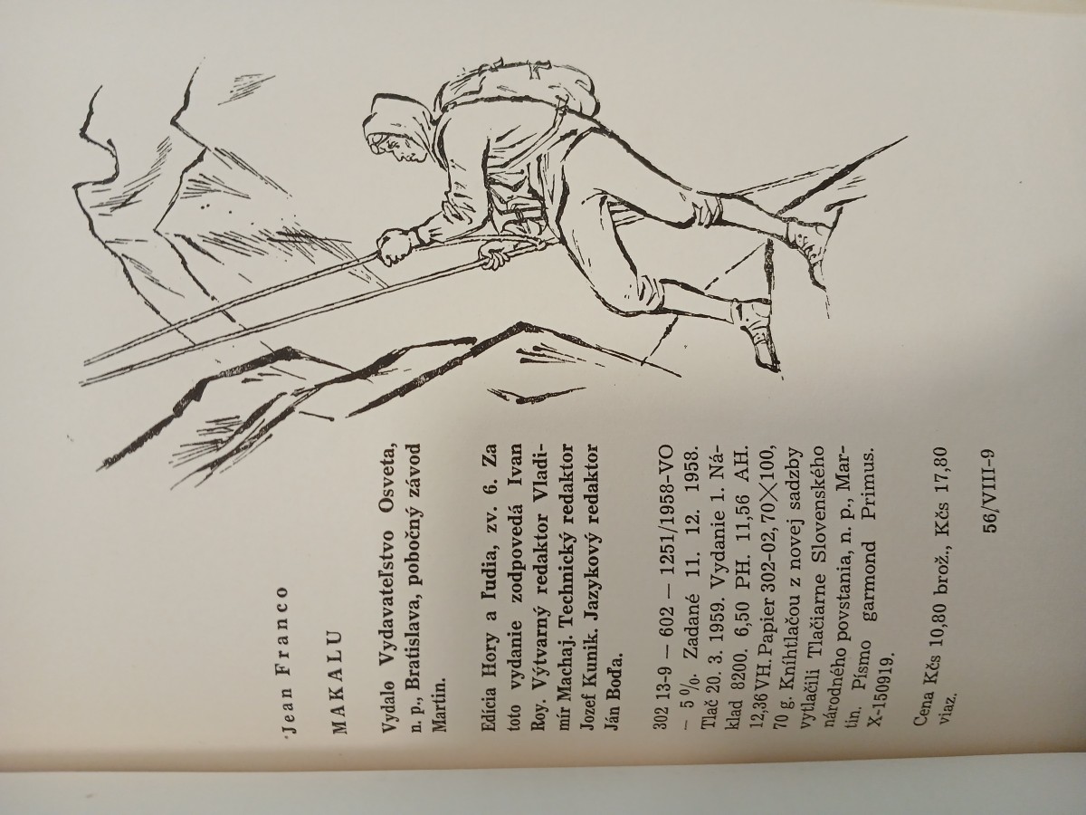 | Digitalizovaná tiráž: | Jean Franco MAKALU Vydalo Vydavateľstvo Osveta, n. p., Bratislava, pobočný závod Martin. Edícia Hory a ľudia, zv. 6. Za toto vydanie zodpovedá Ivan Roy. Výtvarný redaktor Vladi- mír Machaj. Technický redaktor Jozef Kunik. Jazykový redaktor Ján Boda. 302 13-9602 - 1251/1958-VO 5%. Zadané 11. 12. 1958. Tlač 20. 3. 1959. Vydanie 1. Ná- klad 8200. 6,50 PH. 11,56 AH. 12,36 VH. Papier 302-02, 70X100, 70 g. Kníhtlačou z novej sadzby vytlačili Tlačiarne Slovenského národného povstania, n. p., Mar- tin. Písmo garmond Primus. X-150919. Cena Kčs 10,80 brož., Kčs 17,80 viaz. 56/VIII-9 |