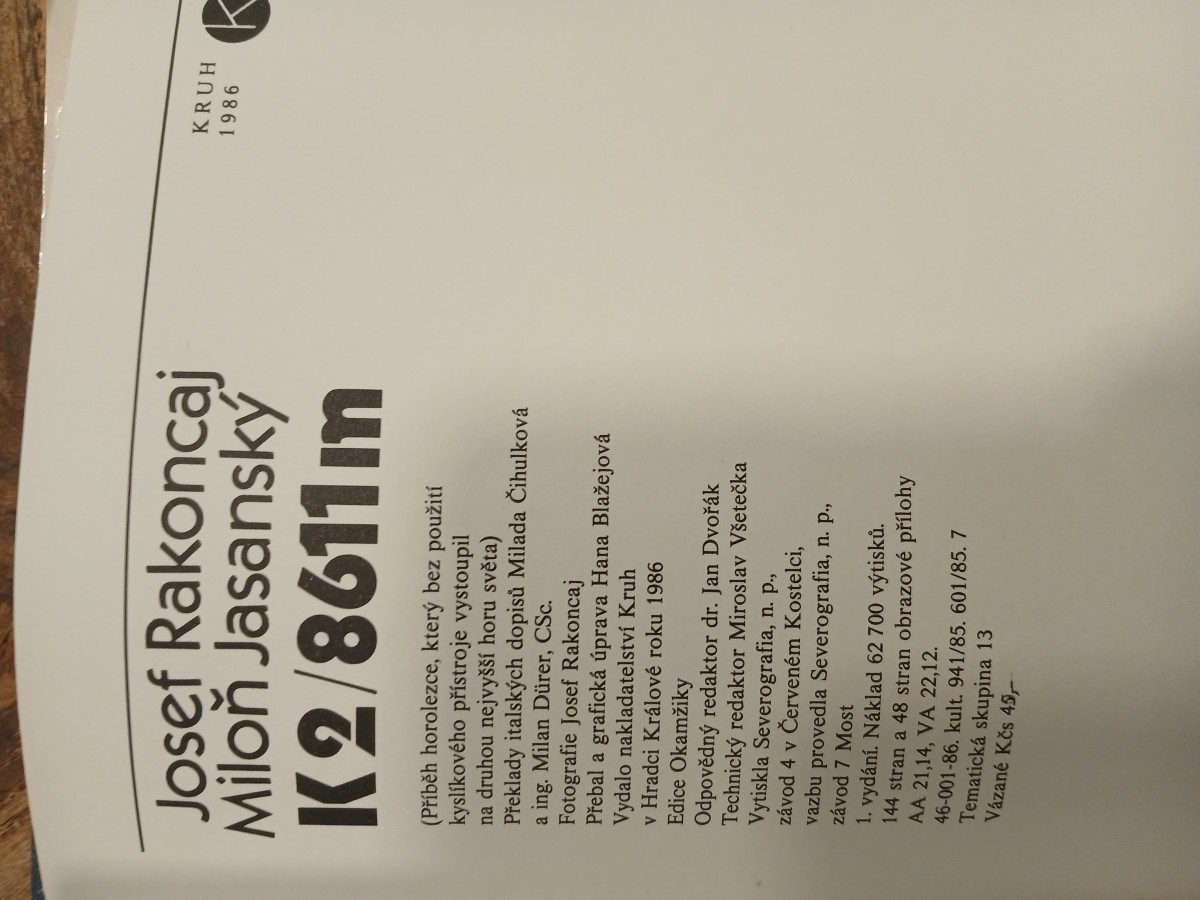 | Digitalizovaná tiráž: | Josef Rakoncaj Miloň Jasanský K2/8611m (Příběh horolezce, který bez použití kyslíkového přístroje vystoupil na druhou nejvyšší horu světa) Překlady italských dopisů Milada Čihulková a ing. Milan Dürer, CSc. Fotografie Josef Rakoncaj Přebal a grafická úprava Hana Blažejová Vydalo nakladatelství Kruh v Hradci Králové roku 1986 Edice Okamžiky Odpovědný redaktor dr. Jan Dvořák Technický redaktor Miroslav Všetečka Vytiskla Severografia, n. p., závod 4 v Červeném Kostelci, vazbu provedla Severografia, n. p., závod 7 Most 1. vydání. Náklad 62 700 výtisků. 144 stran a 48 stran obrazové přílohy AA 21,14, VA 22,12. 46-001-86. kult. 941/85.601/85.7 Tematická skupina 13 Vázané Kčs 45 KRUH 1986 |