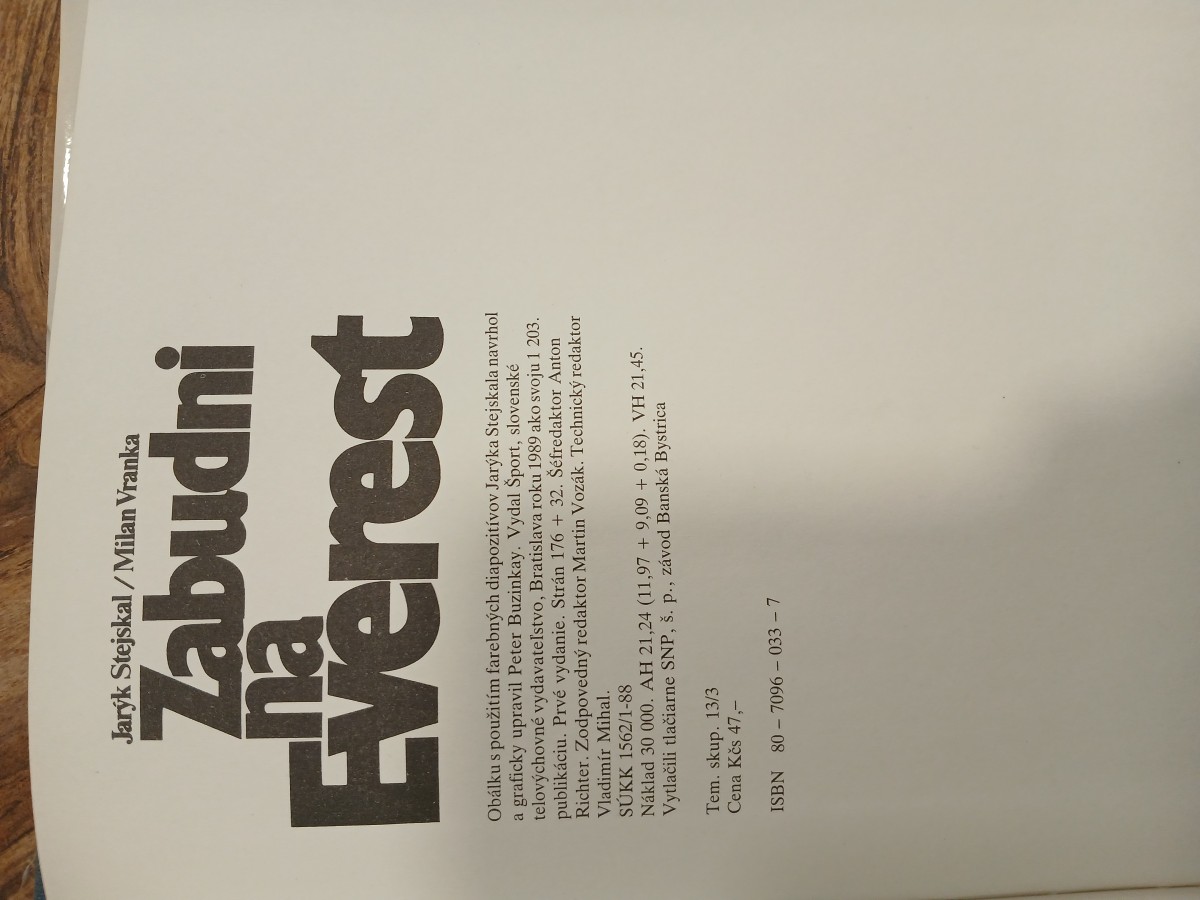 | Digitalizovaná tiráž: | Jaryk Stejskal/Milan Vranka Zabudni Everest Obálku s použitím farebných diapozitívov Jarýka Stejskala navrhol a graficky upravil Peter Buzinkay. Vydal Šport, slovenské telovýchovné vydavateľstvo, Bratislava roku 1989 ako svoju 1 203. publikáciu. Prvé vydanie. Strán 176 + 32. Šéfredaktor Anton Richter. Zodpovedný redaktor Martin Vozák. Technický redaktor Vladimír Mihal. SÚKK 1562/1-88 Náklad 30 000. AH 21,24 (11,97 +9,09 +0,18). VH 21,45. Vytlačili tlačiarne SNP, š. p., závod Banská Bystrica Tem. skup. 13/3 Cena Kčs 47,- ISBN 80-7096-033-7 |
