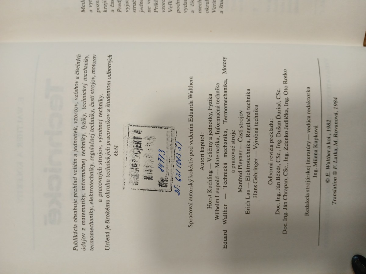 | Digitalizovaná tiráž: | EDÍCIA STROJÁRSKEJ LITERATÚRY Publikácia je určená širokému okruhu technických pracovníkov a študentom odborných škôl CHEMOPROJEKT 4 KNELOVA Eduard Walther a kolektív Technicke vzorce MDT 621(083.5) Z nemeckého originálu Technische Formeln, ktorý vydalo VEB Fachbuch- verlag, Lipsko v 22. vydaní v r. 1982, preložili Ing. František Latka a Magda Rovanová Vydala Alfa, vydavateľstvo technickej a ekonomickej literatúry, n. p., Bratislava, Hurbanovo nám. 3 v októbri 1984, ako svoju 9254. publikáciu Zodpovedná redaktorka Ing. Alena Pospíšilová Technická redaktorka Zora Šinková Obálku a väzbu navrhol Miroslav Floch Vytlačili Západoslovenské tlačiarne, n. p., závod Svornost, ul. Februárového víťazstva 20, Bratislava 432 strán, 430 obrázkov, 44 tabuliek, 3 prílohy, 21,74 AH, 22,40 VH 1. vydanie. Náklad 13 000 výtlačkov 302 05 2 63-164-84 Kčs 24,- 507/21;856 Brož. cena Kčs 19,50 |