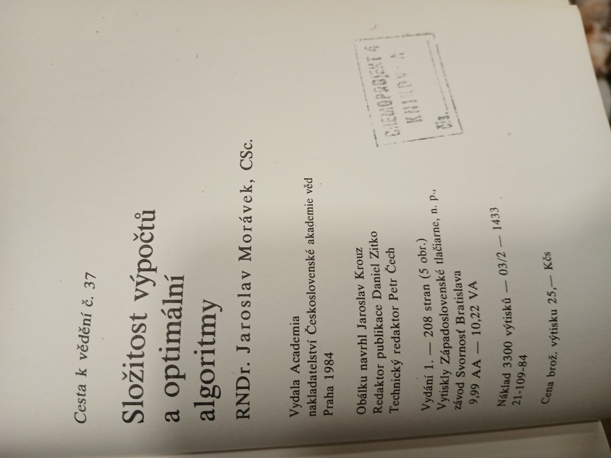 | Digitalizovaná tiráž: | Cesta k vědění č. 37 Složitost výpočtů a optimální algoritmy RNDr. Jaroslav Morávek, CSc. Vydala Academia nakladatelství Československé akademie věd Praha 1984 Obálku navrhl Jaroslav Krouz Redaktor publikace Daniel Zitko Technický redaktor Petr Čech Vydání 1. 208 stran (5 obr.) Vytiskly Západoslovenské tlačiarne, n. p., závod Svornosť Bratislava 9,99 AA - 10,22 VA 03/2 - 1433 Náklad 3300 výtisků - 21-109-84 Cena brož, výtisku 25,- Kčs CHEMOPABJEKT 4 KHINOYA |
