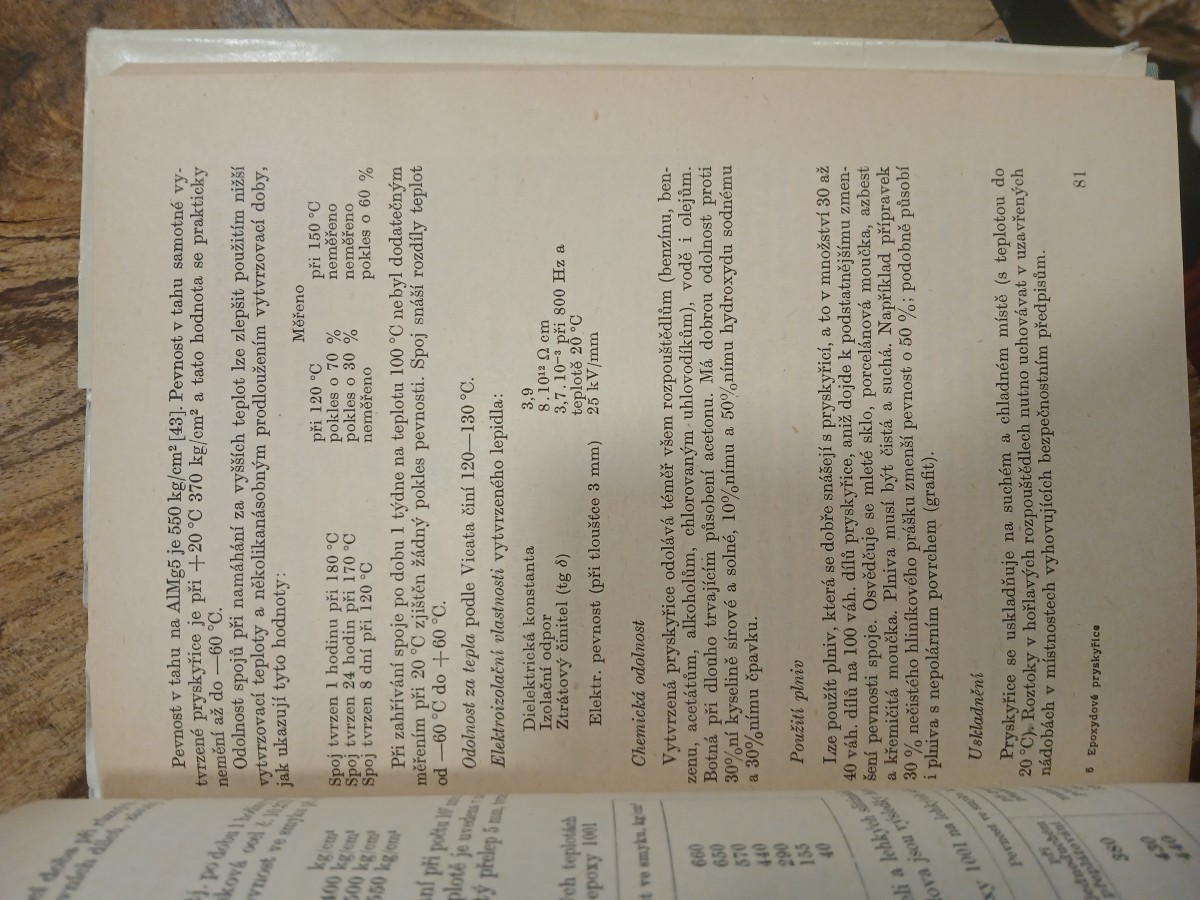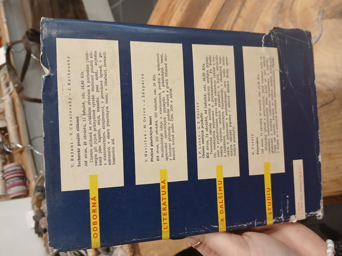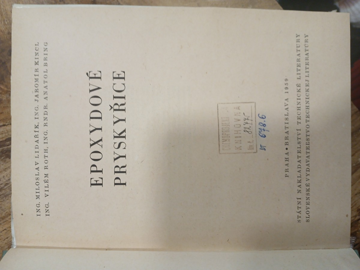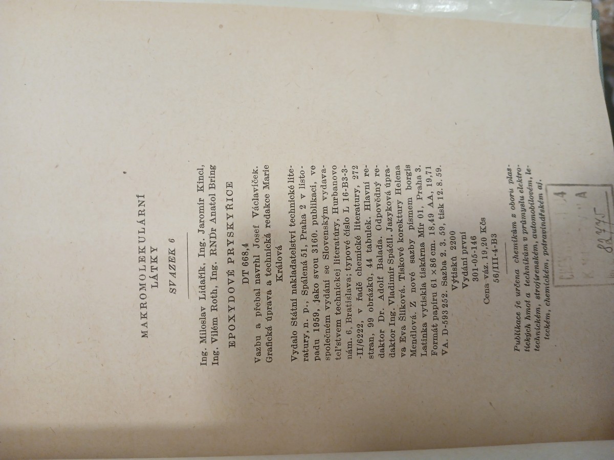 | Digitalizovaná tiráž: | MAKROMOLEKULÁRNÍ LÁTKY SVAZEK 6 Ing. Miloslav Lidařík, Ing. Jaromír Kincl, Ing. Vilém Roth, Ing. RNDr Anatol Bring EPOXYDOVÉ PRYSKY ŘICE DT 668,4 Vazbu a přebal navrhl Josef Václavíček. Grafická úprava a technická redakce Marie Králová Vydalo Státní nakladatelství technické lite- ratury, n. p., Spálená 51, Praha 2 v listo- padu 1959, jako svou 3160. publikaci, ve společném vydání se Slovenským vydava- tel'stvem technickej literatúry, Hurbanovo nám. 6, Bratislava; typové číslo L 16-B3-3- -II/6222, v řadě chemické literatury, 272 stran, 99 obrázků, 44 tabulek. Hlavní re- daktor Dr. Adolf Balada. Odpovědný re- daktor Ing. Vladimír Spáčil. Jazyková úpra- va Eva Šliková. Tiskové korektury Helena Mendlová. Z nové sazby písmem borgis Latinka vytiskla tiskárna Mír 01, Praha 3. Formát papíru 61 x 86 cm. 18,49 AA, 19,71 VA. D-593 252. Sazba 2. 3. 59, tisk 12. 8. 59. Výtisků 2200 Vydání první 301-05-146 Cena váz. 19,20 Kčs 56/III-4-B3 Publikace je určena chemikům z oboru plas- tických hmot a techníkům v průmyslu elektro- technickém, strojírenském, automobilovém, le- teckém, chemickém, potravinářském aj. CHEN 82775 |