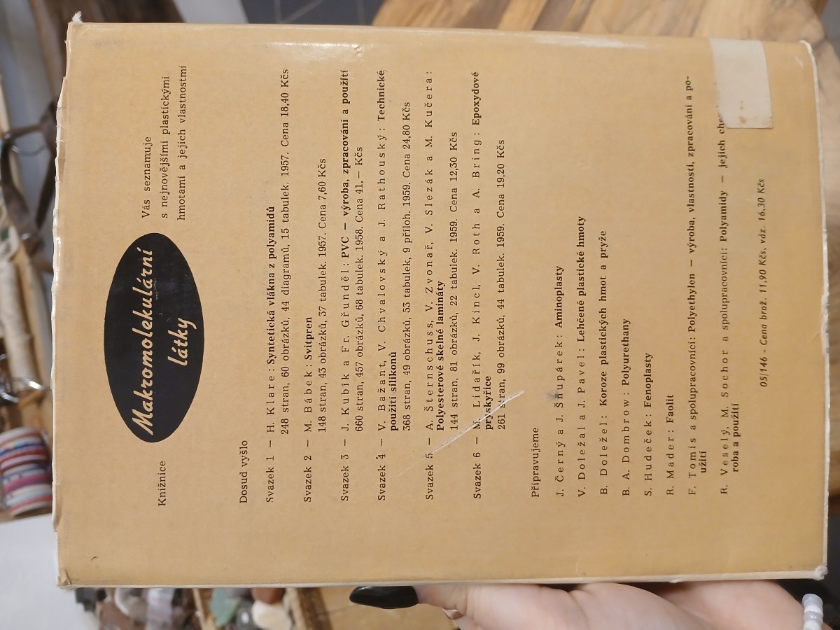 | Digitalizovaná tiráž: | MAKROMOLEKULÁRNÍ LÁTKY SVAZEK 7 H. Gibello, Ing. E. S. C. I. L. STYREN A JEHO POLYMERY Z prvního vydání francouzského originálu Le styrène et ses polymères, s předmlu- vou P. Piganiola, vydaného v nakladatel- ství Dunod, Paříž 1956, přeložili inž. Vladi- mír Doležal, inž. Jaroslav Pavel a inž. Miro- slav Starý, laureát státní ceny - DT 678.771.28 547.538.141-99 Grafická úprava a technická redakce Vlasta Vydalo Státní nakladatelství tech- Vítová nické literatury, n. p., Spálená 51, Praha 2, v dubnu 1960, jako svou 3303. publikaci, ty- pové číslo L 16a-B2-3-III/6309, v řadě che- mické literatury 218 stran, 17 obrázků, 11 tabulek Redakce chemické literatury - Hlavní redaktor dr. Adolf Balada Odpo- vědná redaktorka Jana Mikulášová Ja- zyková úprava a tiskové korektury Helena Mendlová Z nové sazby písmem Latinka vytiskl Mír, novinářské závody, n. p. 1, Praha 3, Václav- ské nám. 15-Formát papíru 61 x 86 cm - D-600688 16,88 AA, 17,79 VA - Sazba - 30.9. 1959, tisk 7. 3. 1960 2200 výtisků Vydání první 05/146 Cena brož. 11,90 Kčs, váz. 16,30 Kčs 56/III-5 (B2) a Publikace je určena pracovníkům v chemickém průmyslu, zejména v oboru plastických hmot, syntetického kaučuku nátěrových hmot, a pracovníkům všech oborů, kde se plastických hmot používá, např. v průmyslu elektrotech- nickém, ve stavebnictví, při výrobě automobilů. letadel a lodí, v obalové technice a při výrobě spotřebního zboží. Kniha bude také dobrou pomůckou pro aludjici na odborných kolách. CHEMOPROJEKT 04 KIA 82856 |