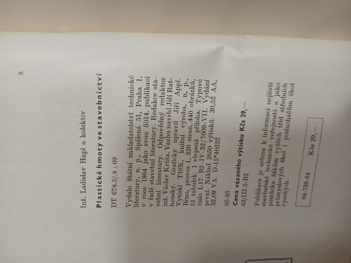 | Digitalizovaná tiráž: | Inž. Ladislav Hapl a kolektiv Plastické hmoty ve stavebnictví DT 678.5/.8: 69 Vydalo Státní nakladatelství technické literatury, n. p., Spálená 51, Praha 1, v roce 1964 jako svou 5014. publikaci v řadě stavební literatury. Redakce sta- vební literatury. Odpovědný redaktor houský. inž. Václav Krůta. Vazbu navrhl Jiří Rat- Graficky upravil Jiří Appl. Vytiskl TISK, knižní výroba, n, p., Brno, provoz 1, 320 stran, 440 obrázků, 51 tabulek. 1 vlepená příloha. Typové číslo L17-B2-IV-32/7609-VII. Vydání 32,09 VA. D-15*40222 první. Náklad 2650 výtisků. 30,52 AA, 05-85 63/III-5-B2 Cena vázaného výtisku Kčs 29,- Publikace je určena k informaci nejširší stavbařské technické veřejnosti a jako vysokých. pomůcka žákům vyšších tříd středních průmyslových škol i posluchačům škol 04-739-64 Kčs 29,- |