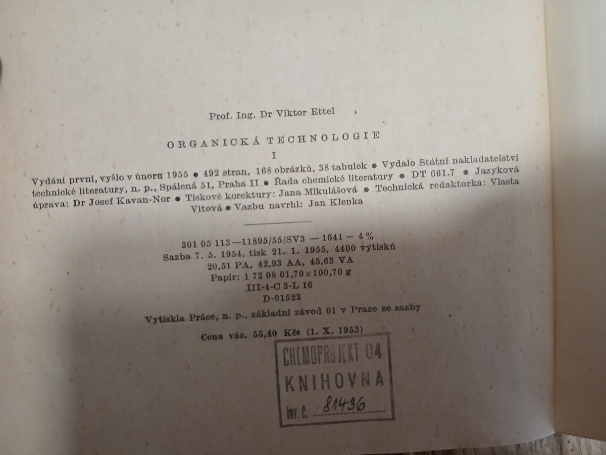 | Digitalizovaná tiráž: | Prof. Ing. Dr Viktor Ettel ORGANICKÁ TECHNOLOGIE I Vydání první, vyšlo v únoru 1955 492 stran, 168 obrázků, 38 tabulek Vydalo Státní nakladatelství technické literatury, n. p., Spálená 51, Praha II Řada chemické literatury DT 661.7 ⚫ Jazyková úprava: Dr Josef Kavan-Nor Tiskové korektury: Jana Mikulášová Technická redaktorka: Vlasta Vítová Vazbu navrhl: Jan Klenka 301 05 113-11895/55/SV3-1641-4% Sazba 7. 5. 1954, tisk 21. 1. 1955, 4400 výtisků 20,51 PA, 42,93 AA, 45,63 VA Papír: 172 08 01,70 x 100,70 g III-4-0 3-L 16 D-01523 Vytiskla Práce, n. p., základní závod 01 v Praze ze sazby Cena váz. 55,40 Kčs (1. X. 1953) CHEMOPROJEKT 04 KNIHOVNA av...81436 |
