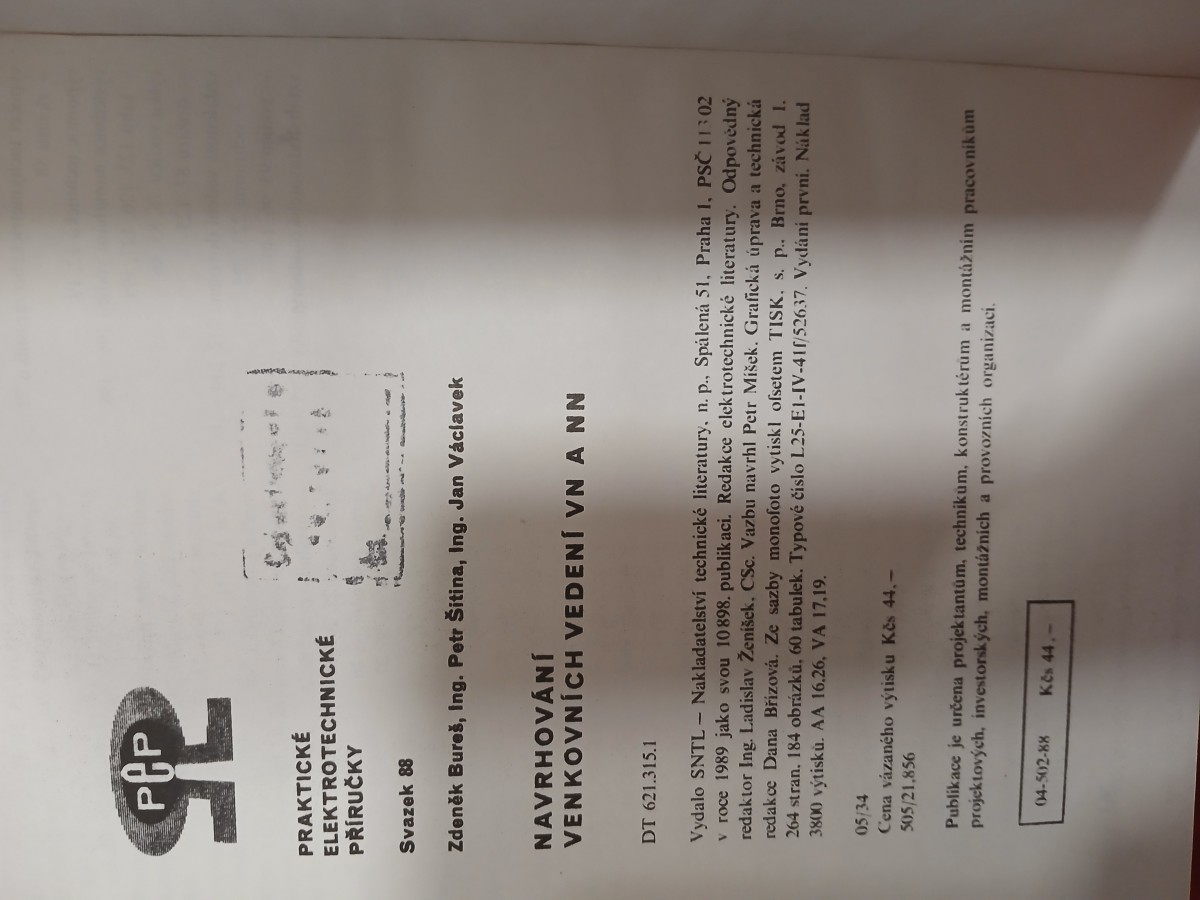| Digitalizovaná tiráž: | PCP ? PRAKTICKÉ ELEKTROTECHNICKÉ PŘÍRUČKY Svazek 88 Zdeněk Bureš, Ing. Petr Šitina, Ing. Jan Václavek NAVRHOVÁNÍ VENKOVNÍCH VEDENÍ VN A NN DT 621.315.1 Vydalo SNTL - Nakladatelství technické literatury. n. p., Spálená 51, Praha 1, PSČ 11302 v roce 1989 jako svou 10898. publikaci. Redakce elektrotechnické literatury. Odpovědný redaktor Ing. Ladislav Ženíšek, CSc. Vazbu navrhl Petr Mišek. Grafická úprava a technická redakce Dana Břízová. Ze sazby monofoto vytiskl ofsetem TISK., s. p., Brno, závod 1. 264 stran. 184 obrázků, 60 tabulek. Typové číslo L25-E1-IV-41f/52637. Vydání první. Náklad 3800 výtisků. AA 16.26, VA 17,19. 05/34 Cena vázaného výtisku Kčs 44,- 505/21,856 Publikace je určena projektantům, technikum, konstruktérům a montážním pracovníkům projektových, investorských, montážních a provozních organizaci. 04-502-88 Kčs 44.- |
