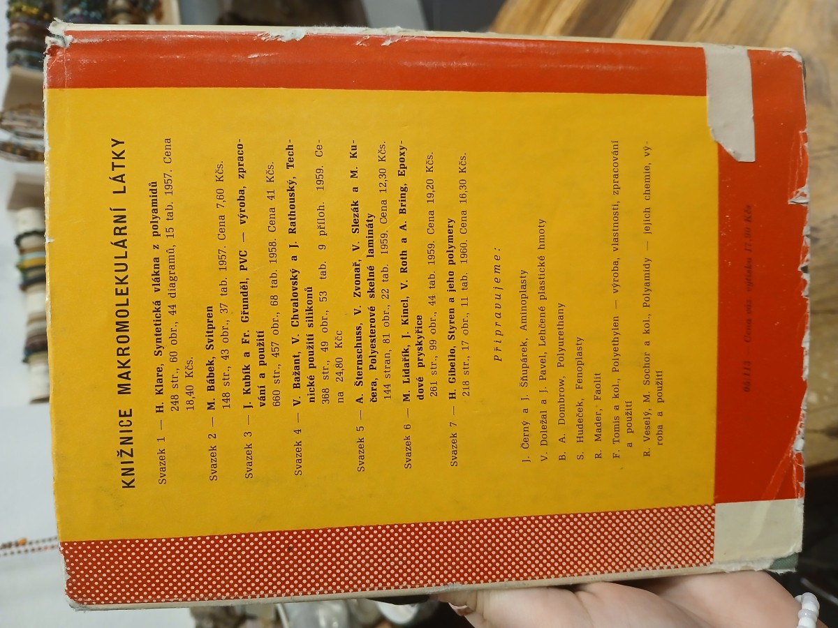 | Digitalizovaná tiráž: | MAKROMOLEKULÁRNÍ LÁTKY SVAZEK 8 Inž. Břetislav Doležel KOROZE PLASTICKÝCH HMOT A PRYŽE DT 679.5.01:620.193 678.1:620.193 Vazbu a přebal navrhl Josef Václavíček Grafická úprava a technická redakce Vlasta Vitová Vydalo Státní nakladatelství technické lite- ratury, n. p., Spálená 51, Praha II, v srpnu 1960 jako svou 3.374 publikaci ve společném vydání se Slovenským vydavateľstvom tech- nickej literatúry v Bratislavě, typové číslo L16a-B3-III-4/6288, v řadě chemické litera- tury. 216 stran, 71 obrázků, 58 tabulek. Hlavní redaktor dr. Adolf Balada. Odpověd- ná redaktorka inž. Marie Mervartová.Jazyko- vá úprava Eva Šliková. Tiskové korektury Helena Mendlová. Z nové sazby písmem borgis Latinka vytiskla tiskárna Mír 01. Praha 3. Formát papíru 61 x 86 cm, 14,89 AA, 17,97 VA-D-02 01276-Sazba 9. 11. 1959, tisk 23. 6. 1960 2800 výtisků - Vydání první. 05/113 Cena váz. 17,90 Kčs 56/III-4(B3) Určeno technikům, konstruktérům a inženýrům v provozech a výzkumných ústavech oboru chemického, strojírenského a potravinářského i ve všech ostatních oborech, kde se plastických hmot používá. CHEMOPROJEKT 04 KNIHOVNA lav. &.. 4509 |