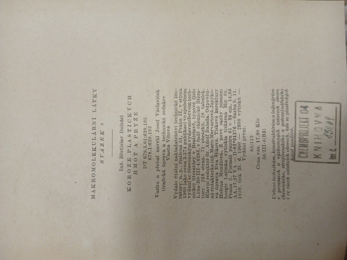 | Název: | Koroze plastických hmot a pryže : určeno technikům, konstruktérům a inž. v provozech a výzkum. ústavech oboru chem., strojír. a potravinářského |